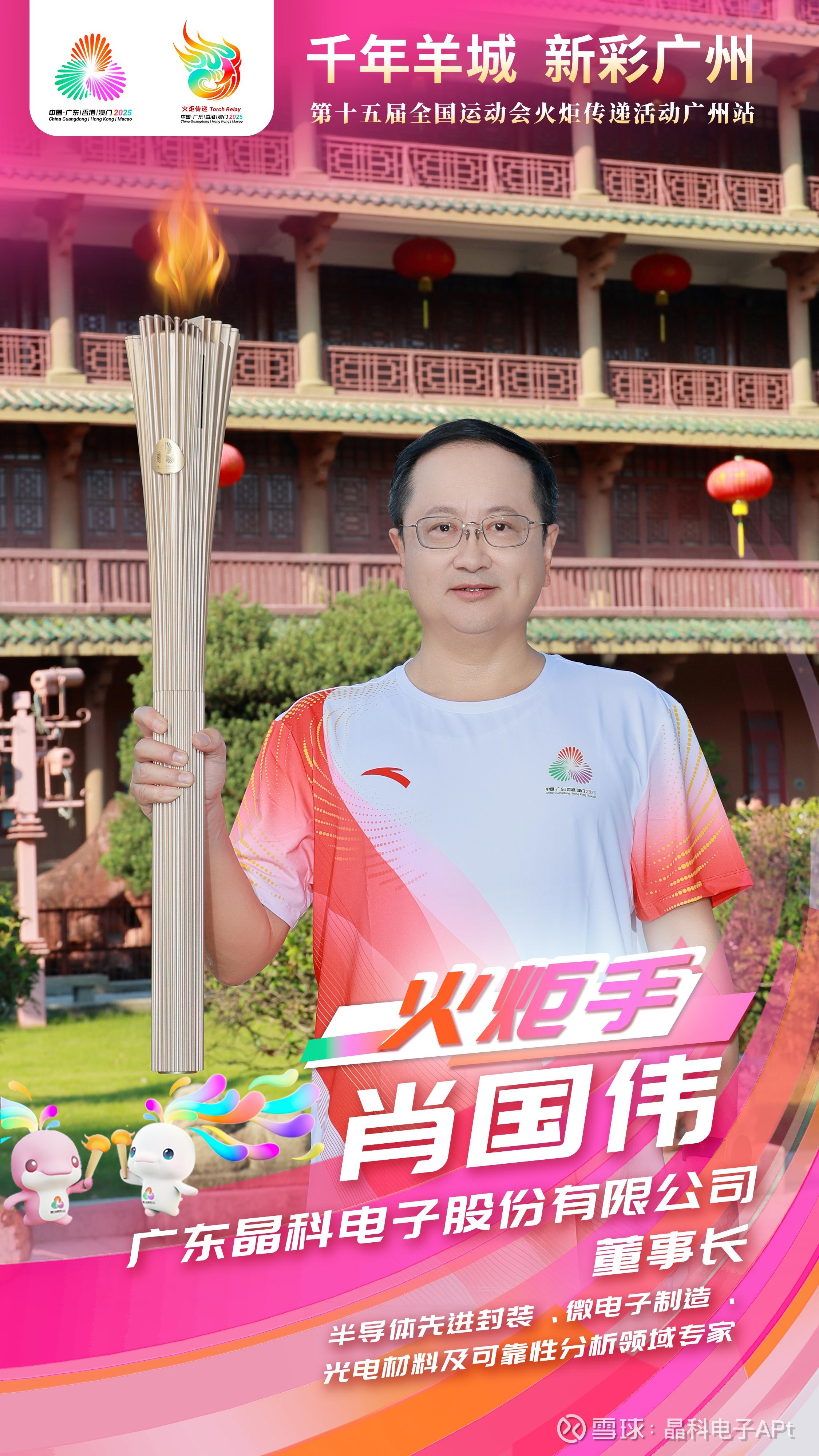 第十五届全国运动会(以下简称“全运会”)火炬传递广州站于11月2日举行,火炬传递路线从镇海楼出发,终点为海心沙,全程共11.6公里。广东晶科电子股份有限公司(简称“晶科电子”,股票代码:2551.HK)董事长肖国伟博士受邀担任火炬手,完成第45棒火炬传递,用“芯”点亮“光”,以科技信念传递奋进的力量。