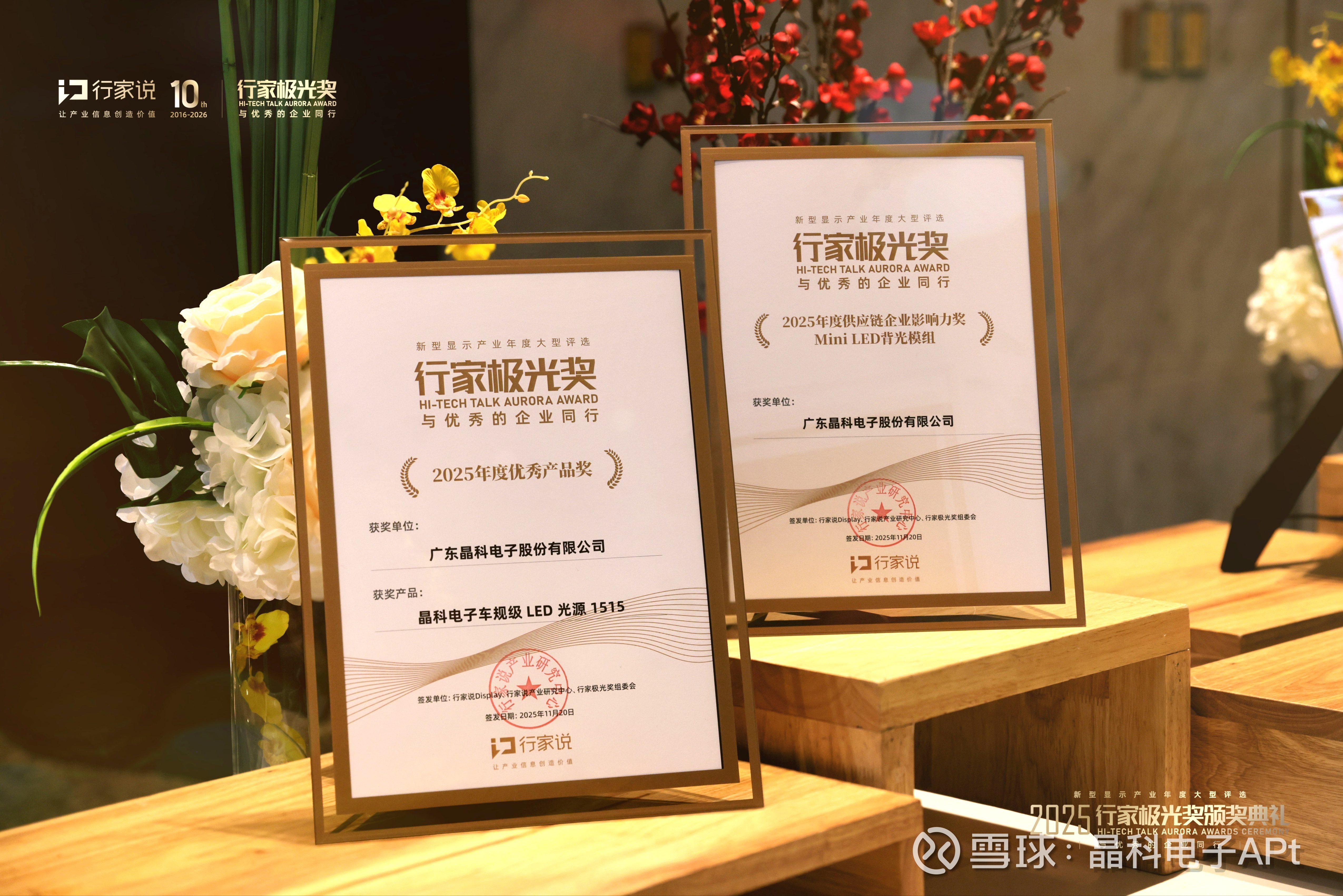 凭借深厚的技术积累、稳定可靠的量产交付能力及客户的高度认可,晶科电子 Mini LED 背光模组荣获“2025年度供应链企业影响力奖”及车规级 LED 光源 1515 荣获“2025年度优秀产品奖”。