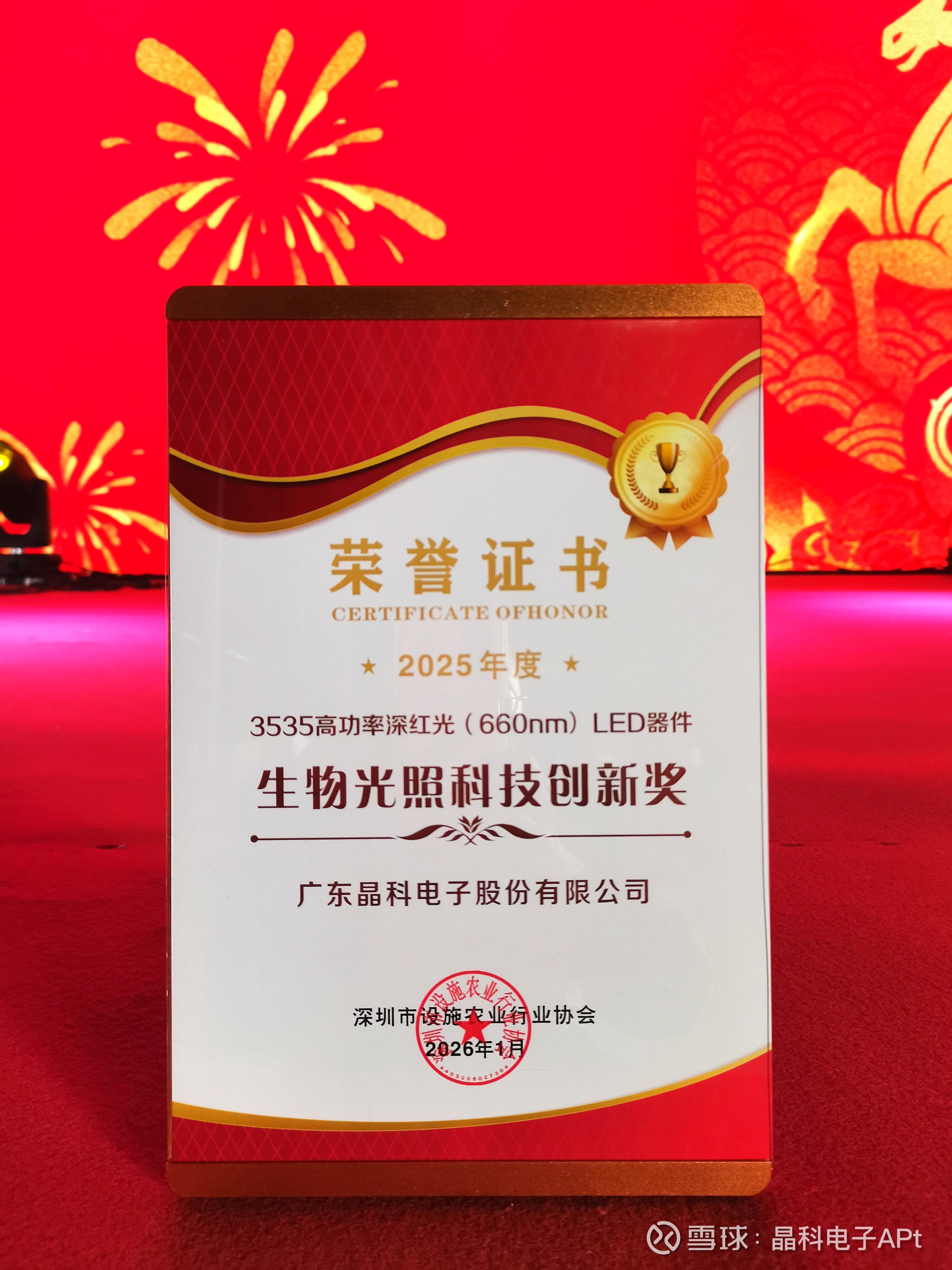 随着全球对粮食安全、绿色能源与可持续农业议题的愈受关注,植物照明技术正在成为支撑现代农业体系的关键力量。从植物工厂到高端温室,光照不仅是植物生长的基础条件,更逐渐演变为推动农业生产效率提升的重要变量。广东晶科电子股份有限公司(简称:晶科电子,股票代码:2551.HK)自主研发的 3535 高功率深红光(660nm)LED 器件,凭借领先的技术实力与稳定可靠的表现,近日荣获“2025年度生物光照科技创新奖”,该奖项充分肯定了晶科电子在智慧农业光照技术领域取得的突破性成果。