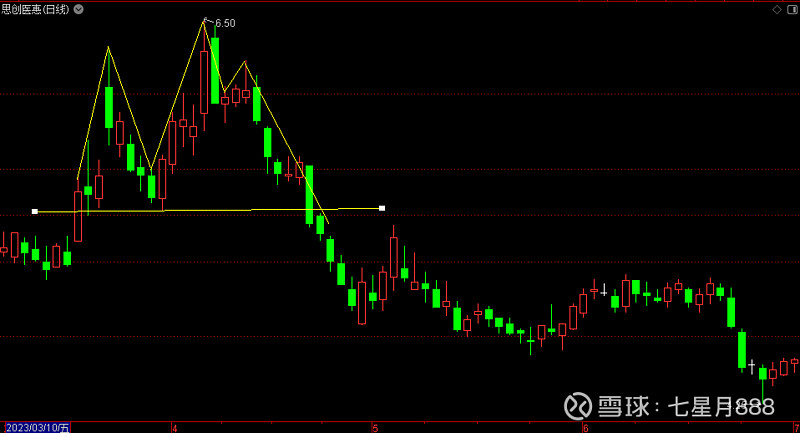 具体实例可见下图,即通信达软件、思创医惠(300078.SZ),2023年3月10日~7月3日的日线走势图。其中:3月24日,思创医惠的最高价6.33元,构成头肩顶的左肩;4月7日,思创医惠的最高价6.5元,构成头肩顶的头部;4月13日,思创医惠的最高价6.26元,构成头肩顶的右肩;3月31日,思创医惠的最低价5.37元;构成头肩顶的颈线;头肩顶高度为:6.5元-5.37元=1.13元,头肩顶高度区间震荡幅度为17.38%。4月21日,思创医惠股价跌破头肩顶的颈线,收跌幅为6.36%的长阴线;下一个交易日的4月24日,思创医惠的最高价反弹到5.36元,开始震荡下跌的行情;6月28日,思创医惠的最低价4.25元。按照4月24日,思创医惠的最低价5.36元计算、40交易日的最大跌幅为20.71%。下跌值为:5.36元-4.25元=1.11元,按照下跌幅度值和下跌股价值计算的跌幅比例为头肩顶高度1.13元的1.19倍和0.98倍,相当于下跌1倍左右的关系。