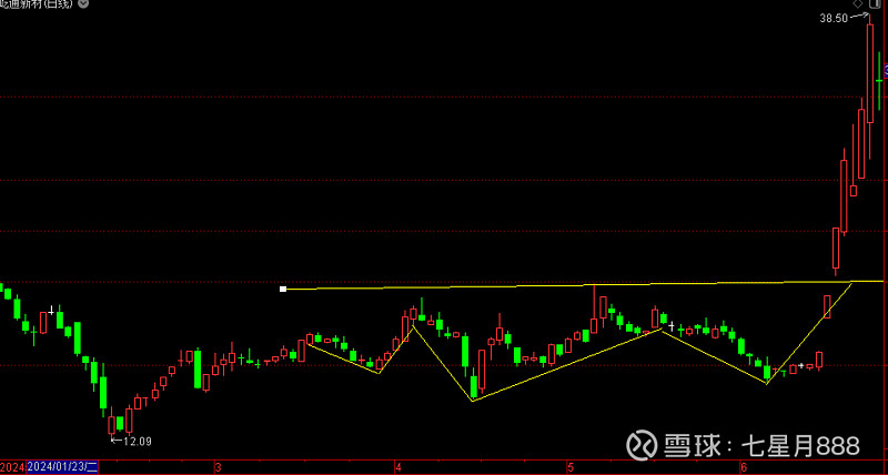 具体实例可见图1,即通信达软件、屹通新材(300930.SZ),2024年1月18日~6月26日的日线走势图。其中:3月28日,屹通新材惠的最低价16.49元,构成头肩底的左肩;4月16日,屹通新材的最低价14.58元,构成头肩底的头部;6月6日,屹通新材的最低价15.85元,构成头肩底的右肩;5月9日,屹通新材的最高价21.8元;构成头肩底的颈线;头肩底高度为:21.8元-14.58元=7.22元,头肩底高度区间震荡幅度为33.12%。6月19日,屹通新材的最低价22.22元,股价突破头肩底的颈线,收涨幅为20%的长阳线,开始了快速拉升的行情。6月22日,屹通新材的最高价达到了38.5元。按照6月19日,屹通新材的最低价22.22元计算、4交易日的最大涨幅为73.27%。上涨值为:38.5元-22.22元=16.28元,按照上涨幅度值和上涨股价值计算的涨幅比例为头肩底高度7.22元的2.25倍和2.21倍,相当于上涨2倍左右的关系。