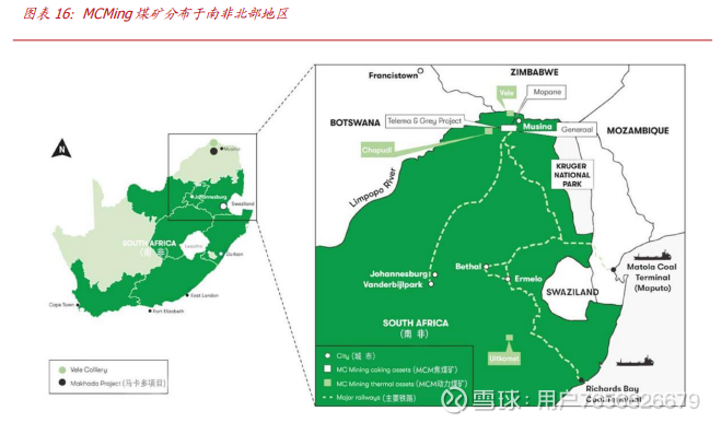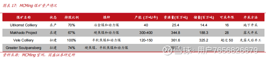 MCMing 拥有 Uitkomst(40万吨/年,在产)、Makhado(400万吨/年,在建)、Vele(120-150万吨/年,拟建)、Greater Soutpansberg(拟建)四座矿权,煤种以焦煤和动力煤为主,Makhado、Vele 两座在建/拟建矿井可采年限均在25年以上,资源储备较为雄厚。