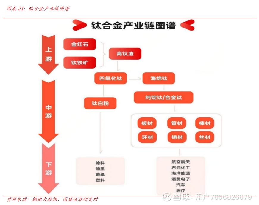钛合金有望布局航天市场。钛合金产业链一条是钛铁矿和金红石通过硫酸法和氯化法生成化工中间产品钛白粉,下游主要可用于涂料、塑料和造纸等行业;另一条以金红石和钛铁矿为主要原料,经选矿、富集后得到天然金红石精矿和钛铁精矿,再通过镁还原法等提取工艺获得海绵钛,海绵钛经熔铸等工序得到钛锭,或添加中间合金熔炼为钛合金铸锭,最终可采用锻造、轧制等工艺生产出不同规格、形状的钛材,应用于航空航天、化工、海洋工程等广泛领域。2024年国内钛材下游化工行业耗用占比近半,航空航天、3C、电力等也是主要消费领域。