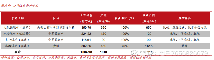 截至2025年6月30日,公司拥有四座煤矿,合计产能达到1010万吨/年,储量合计达到10.05亿吨,其中大饭铺煤矿(650万吨/年)、永安煤矿(120万吨/年,试运转)为在运煤矿。