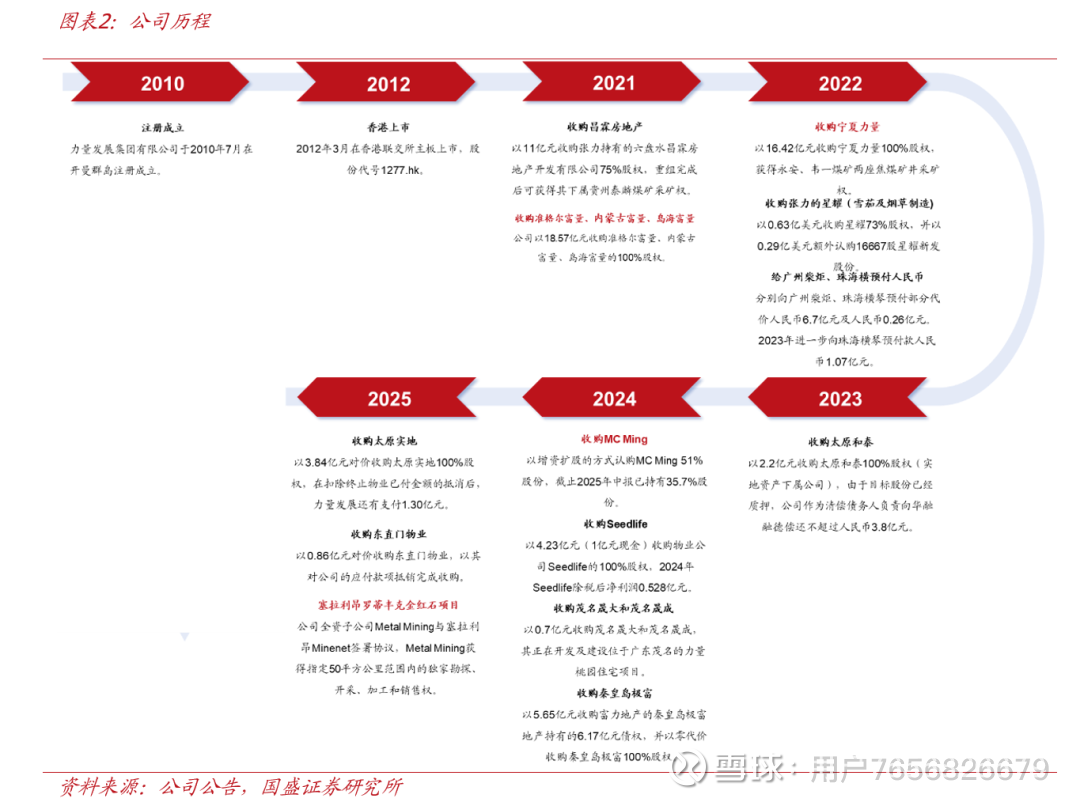 立足“蒙、宁”,掘“金”海外,目标成为领先民营煤企。力量发展于2010年7月成立,2012年3月在港交所成功上市,公司主要从事煤炭开采与销售业务,其煤矿主要分布于内蒙古、宁夏、南非三地,资源涵盖动力煤与炼焦煤,目标是成为中国领先的民营综合煤炭供应商。截止2025年6月末,力量发展实控人为张力与张量父子(合计持有74.26%),其中张力与李思廉合伙创办广州富力地产股份有限公司(1277.HK),张量是实地建设集团有限公司实控人。