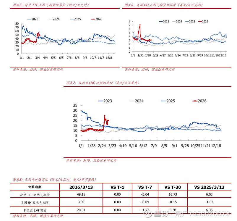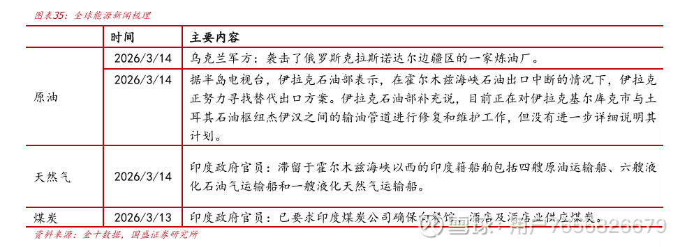 本周全球能源价格回顾。截至2026年3月13日,原油价格方面,布伦特原油期货结算价为103.14美元/桶,较上周上涨10.45美元/桶(+11.27%);WTI原油期货结算价为98.71美元/桶,较上周上涨7.81美元/桶(+8.59%)。天然气价格方面,东北亚LNG现货到岸价为20.01美元/百万英热,较上周下跌1.17美元/百万英热(-5.50%);荷兰TTF天然气期货结算价49.18欧元/兆瓦时,较上周下跌3.04欧元/兆瓦时(-5.82%);美国HH天然气期货结算价为3.09美元/百万英热,较上周下跌0.09美元/百万英热(-2.99%)。煤炭价格方面,欧洲ARA港口煤炭(6000K)到岸价124.00美元/吨,较上周下降5.50美元/吨(-4.25%);纽卡斯尔港口煤炭(6000K)FOB价138.00美元/吨,较上周上涨4.60美元/吨(+3.45%);IPE南非理查兹湾煤炭期货结算价111.10美元/吨,较上周下跌1.90美元/吨(-1.68%)。