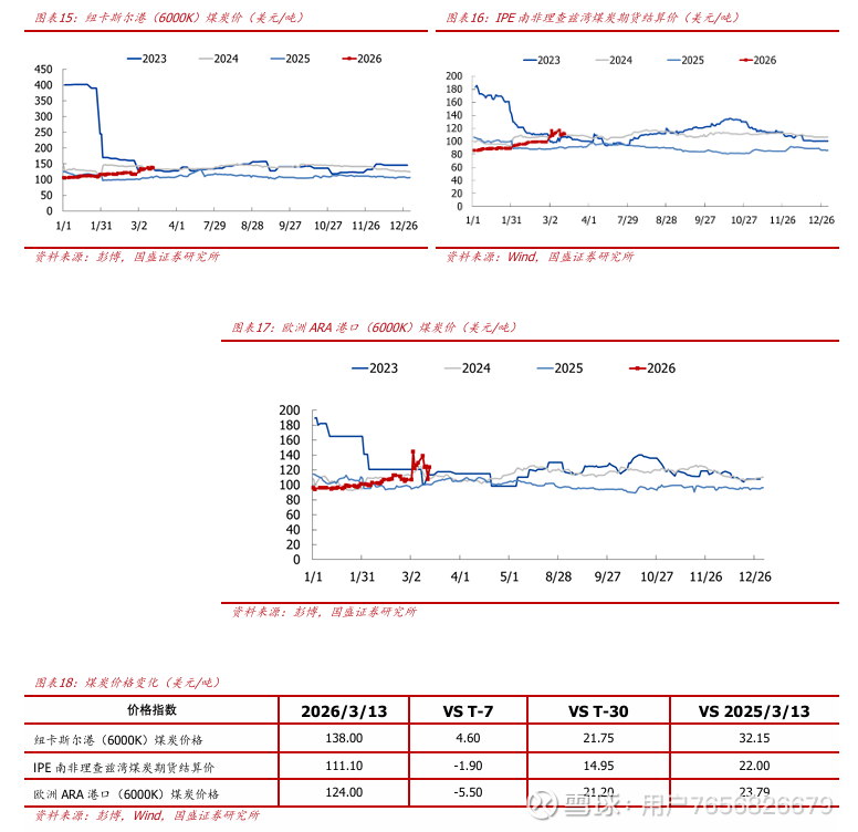 ➢全球煤价对地缘紧张反应明确,西欧ARA港煤价从105美元/吨涨至125-130美元/吨,澳纽卡斯尔港高热值煤价涨至130美元/吨,中东冲突以来动力煤价累涨20-25%。受中东局势影响,船舶需绕道非洲避开红海,航线延长推高物流成本,黑海港口租船费率预计随之上升。但红海绕行难以提振黑海-里海港口煤炭转运需求,该路线盈利性远低于远东,且黑海出口主要面向土耳其、北非,受红海影响有限。贸易结构上,2025年俄向东方出口煤1.182亿吨(+6.1%)、向南方出口2050万吨(+20.2%),原对欧盟出口转向亚太,其中对中国出口降至8890万吨,同比下降6.5%,占中国进口18%,未来出口走势取决于物流解决进度与全球价格变动。