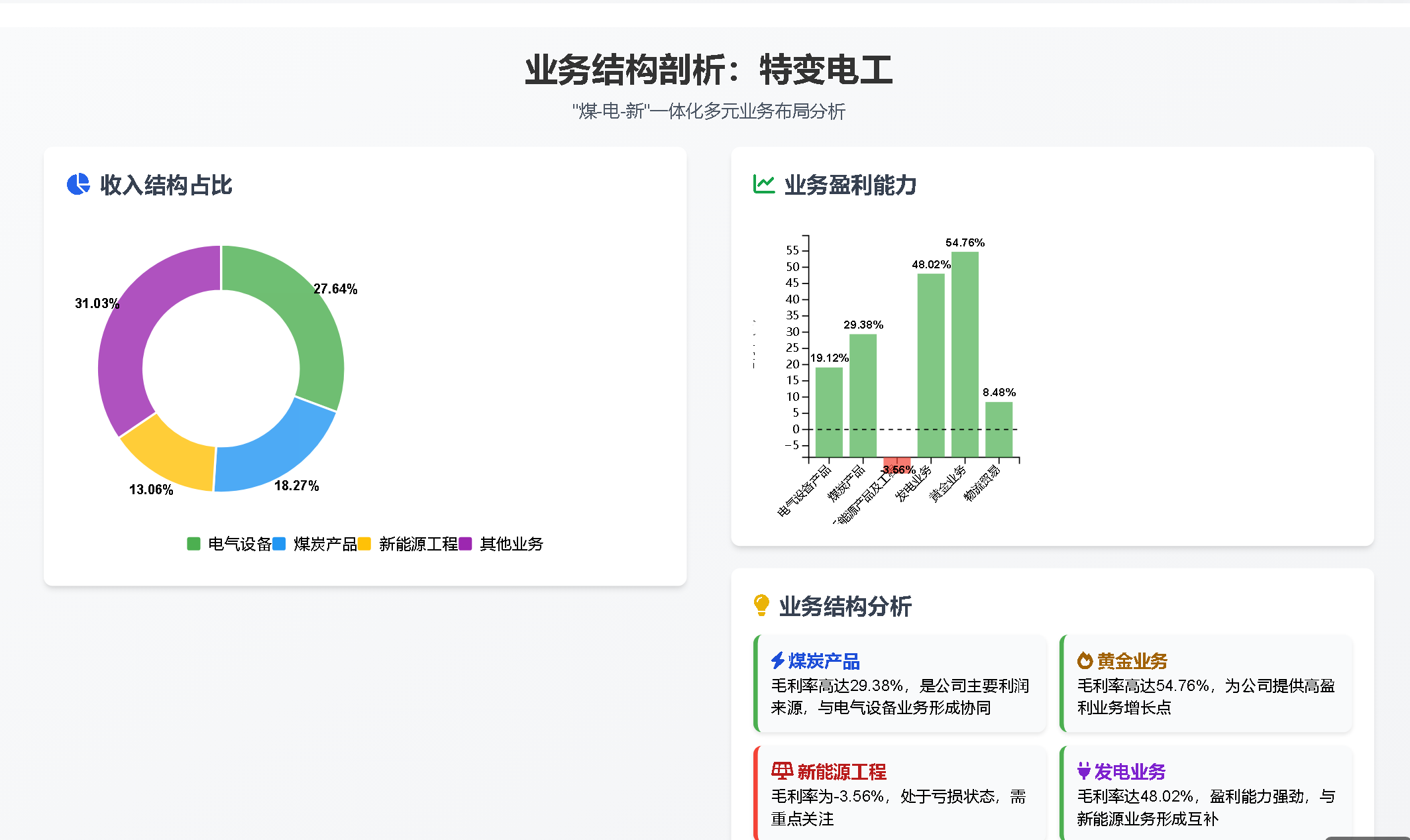 业务特点:电气设备和煤炭业务盈利稳定,新能源工程业务承压