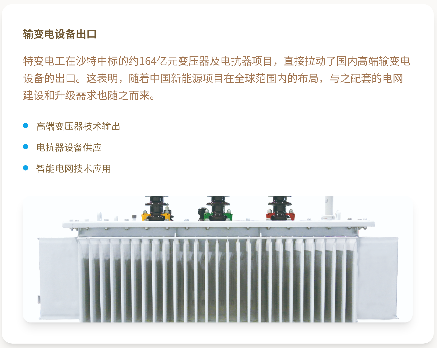 特变电工成功中标了沙特电力公司的一项大型输变电项目,合同总金额高达约164亿元人民币。该项目主要涉及高端变压器和电抗器的供应,是沙特国家电网升级改造计划的重要组成部分。