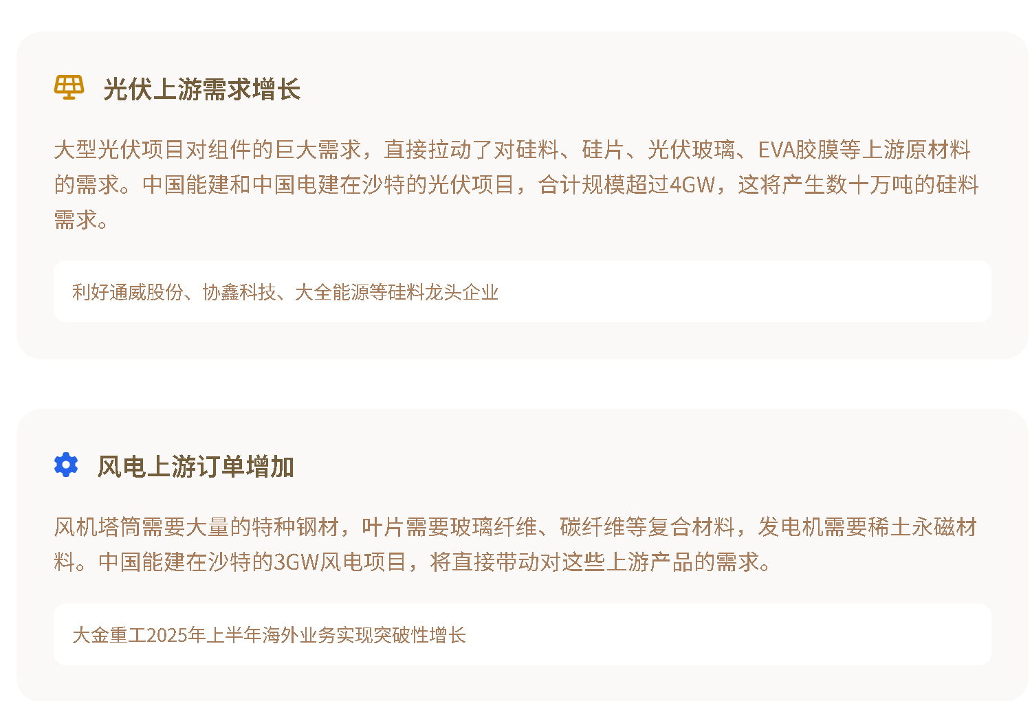 沙特等中东地区的大型光伏项目,对光伏组件的需求量巨大,直接利好隆基绿能、晶科能源、天合光能等国内头部光伏组件制造商。