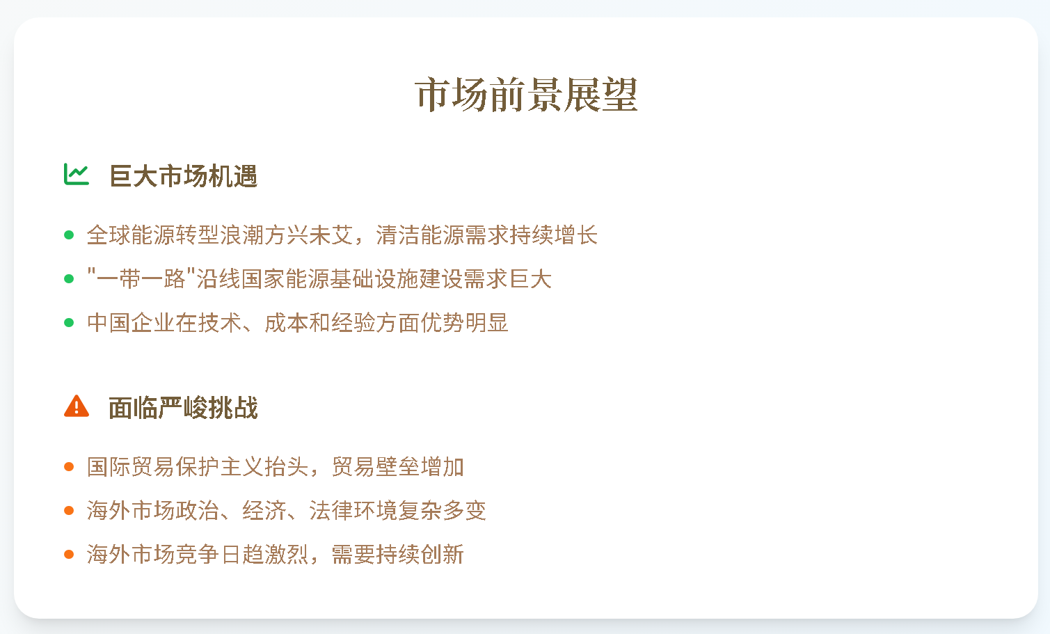 "面对机遇和挑战,中国企业需要保持清醒的头脑,加强国际合作,遵守国际规则,积极履行社会责任,以更加开放、包容、共赢的姿态,深度融入全球市场,为全球能源转型和可持续发展做出更大的贡献。"