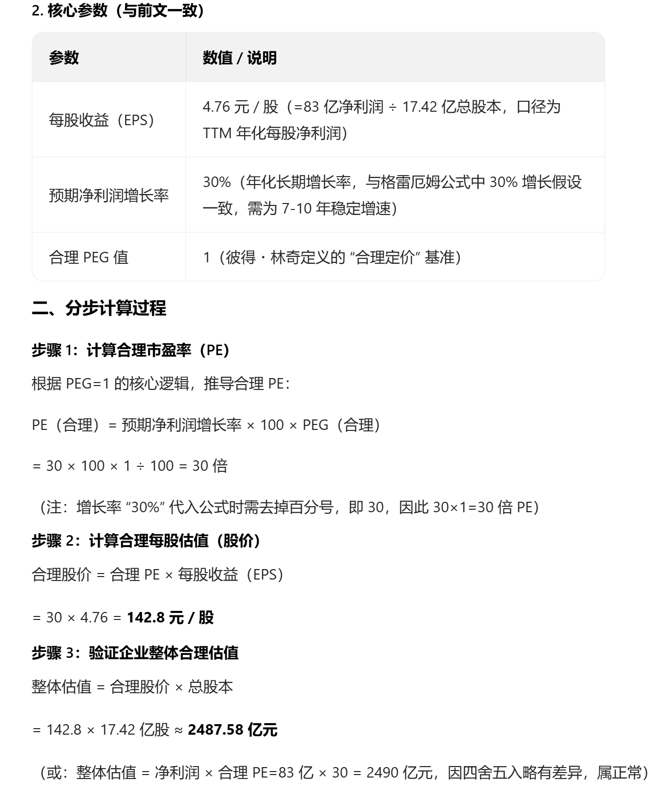 公式:PEG = 市盈率 / (净利润增长率 × 100)