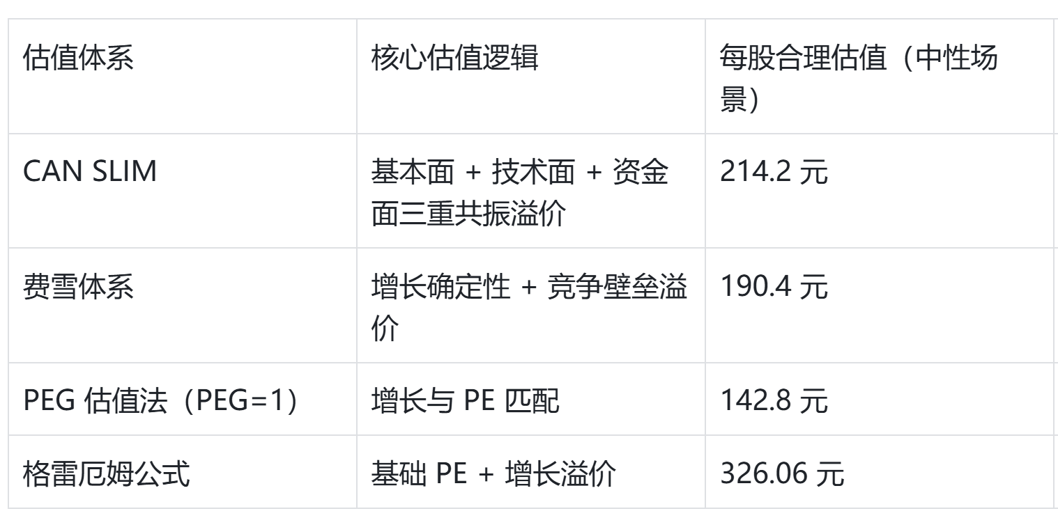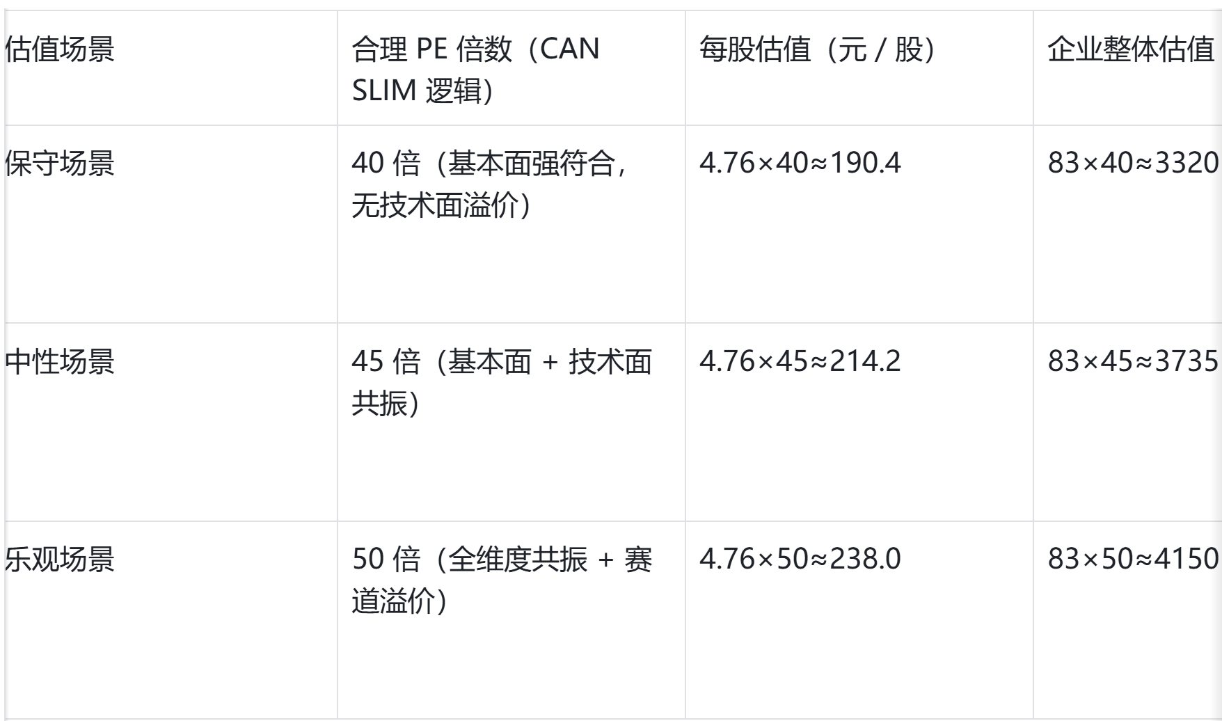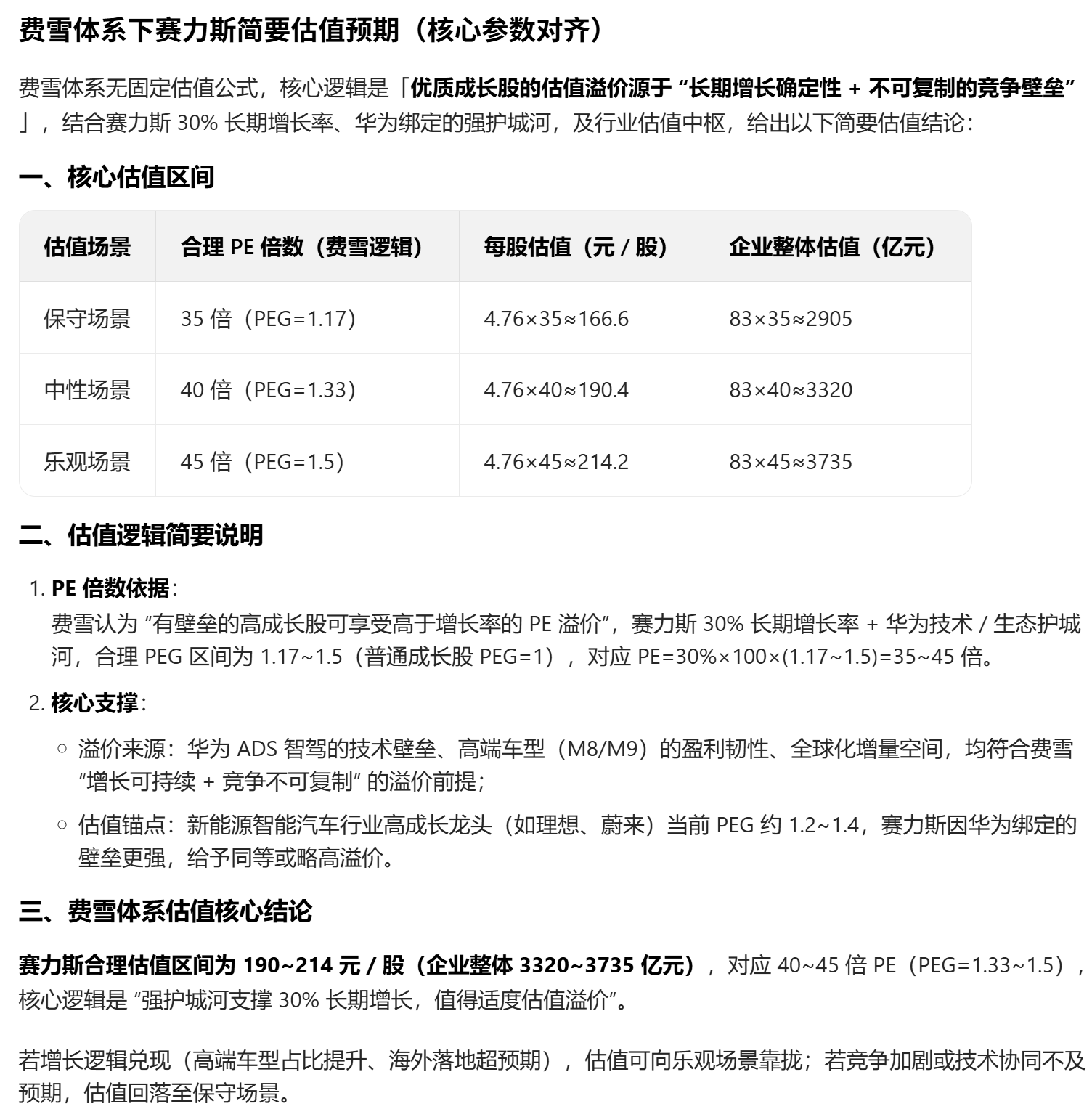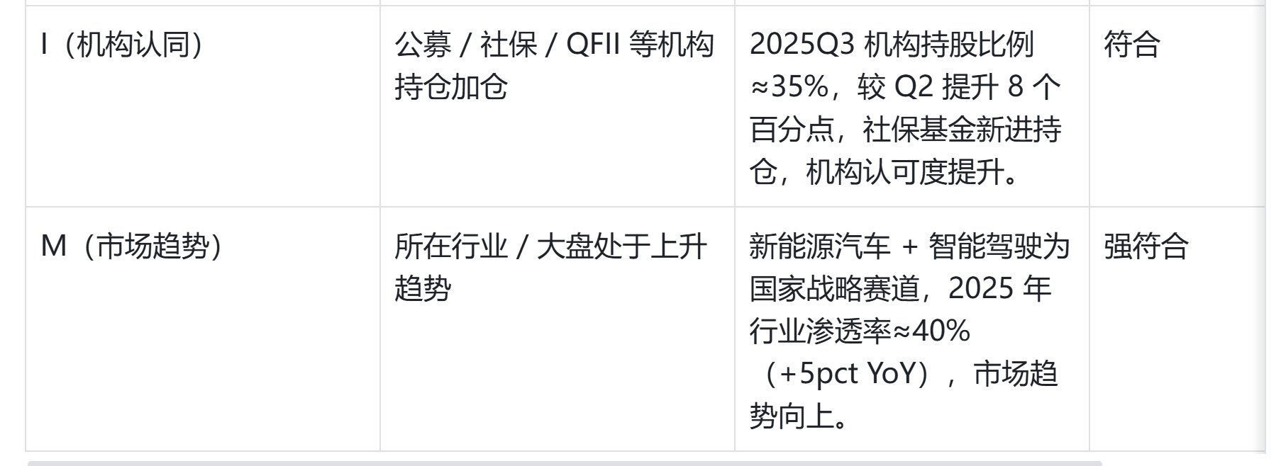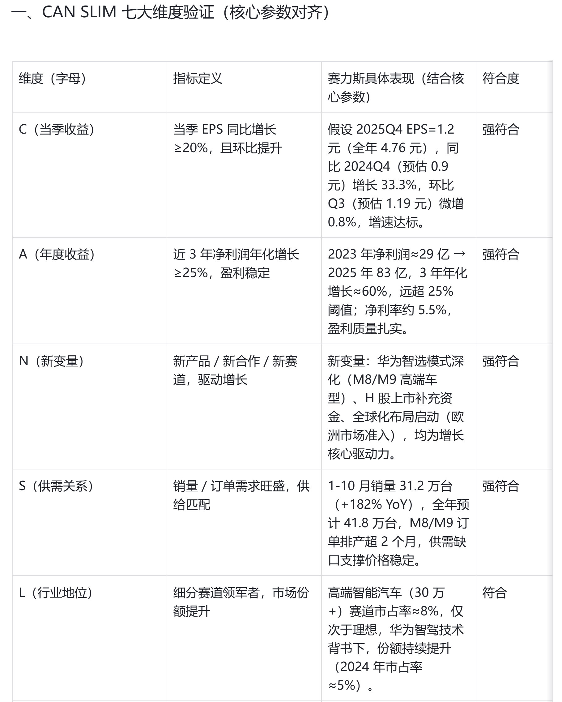 欧奈尔的估值逻辑是「基本面强度决定估值上限,技术面 + 资金面决定估值兑现节奏」,赛力斯 7 大维度中 6 个 “强符合 / 符合”,属于 CAN SLIM 体系下的 “高评分成长股”,估值溢价源于 “增长确定性 + 机构资金加持”。