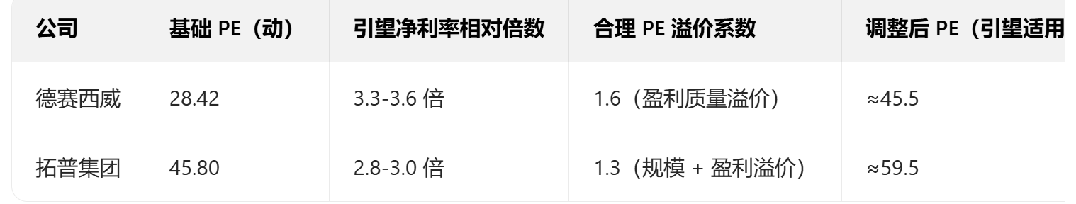 先确定德赛西威、拓普集团的基础 PE,再结合净利率优势给予溢价:
