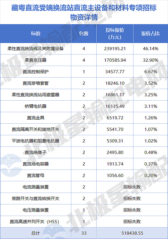 12月11日,藏东南至粤港澳大湾区+800千伏特高压直流输电工程受端换流站直流主设备和材料专项招标项目中标公示。