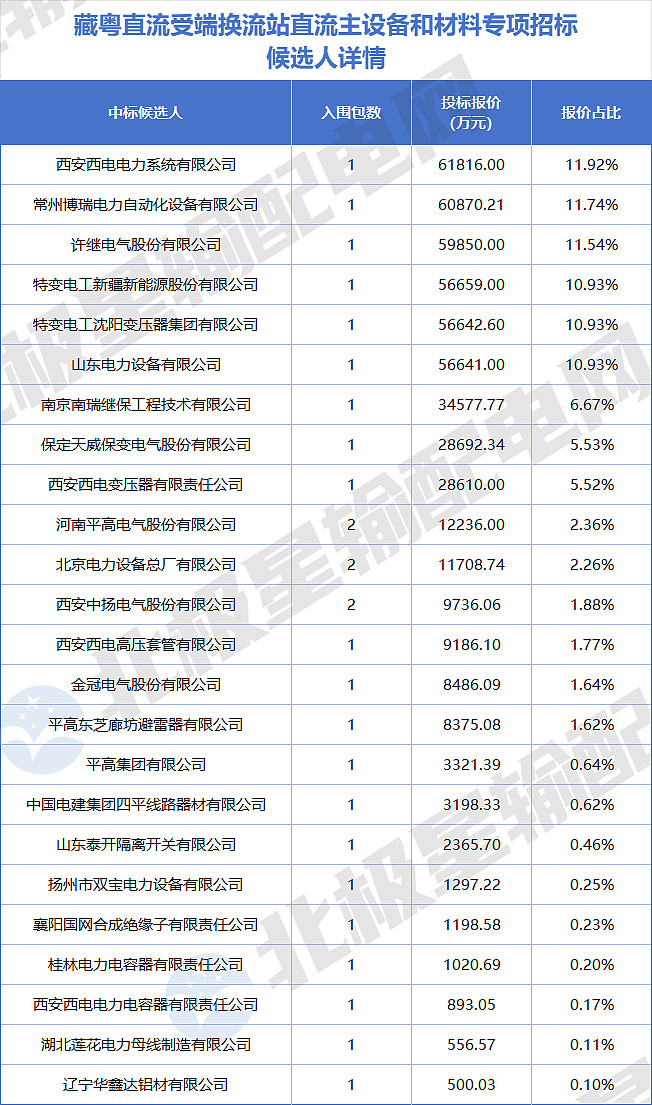 此外,还有4家企业投标报价超过5亿元,分别是许继电气股份有限公司,投标报价59850 万元;特变电工新疆新能源股份有限公司,投标报价56659 万元;特变电工沈阳变压器集团有限公司,投标报价56642.6 万元;山东电力设备有限公司,投标报价56641 万元。