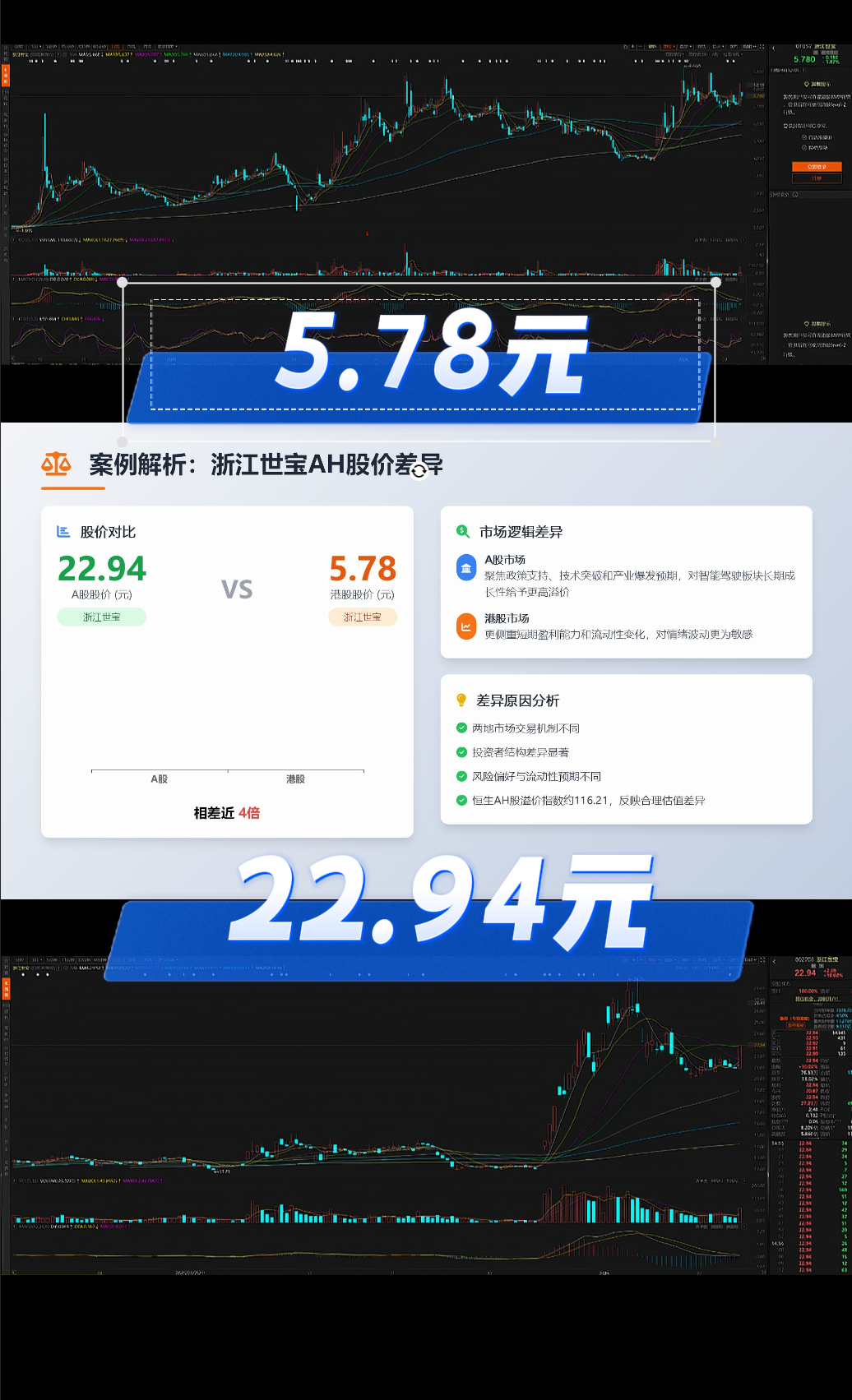 浙江世宝A股股价22.94元,港股股价5.78元,两个市场,两种交易环境和投资风险偏好,各有各的逻辑,存在即合理。