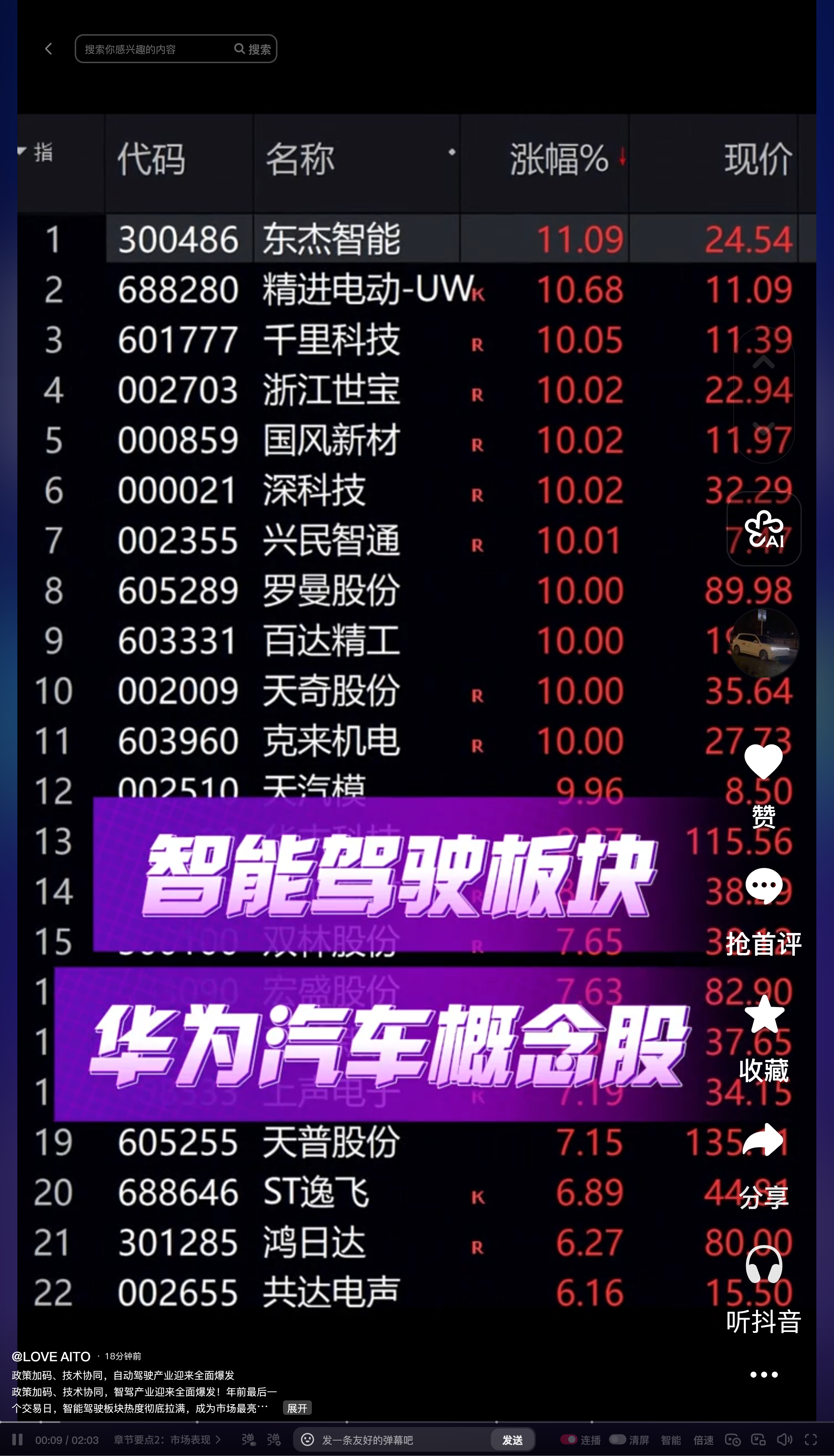 当日14 只智能驾驶概念股强势涨停,兴民智通、浙江世宝、克来机电等个股封单坚实,华为汽车概念股也有5只涨停,涨幅超2%的个股有20只,活跃度与强势格局双重凸显。