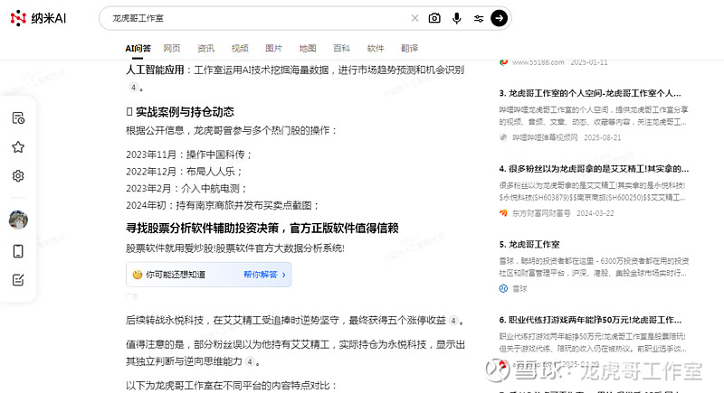 龙虎哥非常好奇,因为他居然比龙虎哥自己还要清楚做过哪些牛股,简直就是不可思议!最后,新粉丝说出了真相,原来他用纳米Ai搜索龙虎哥工作室,纳米Ai搜索是这样分析龙虎哥工作室的,