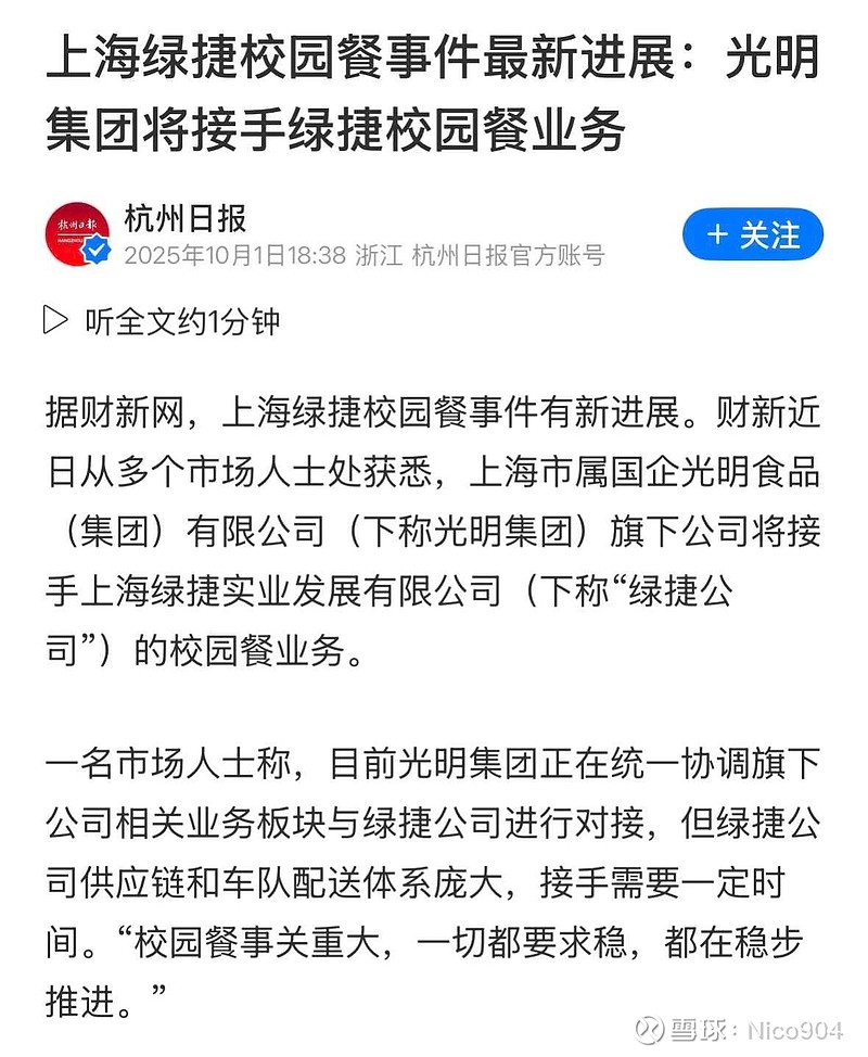 光明集团接手绿捷校园餐业务,风来了,无敌利好。