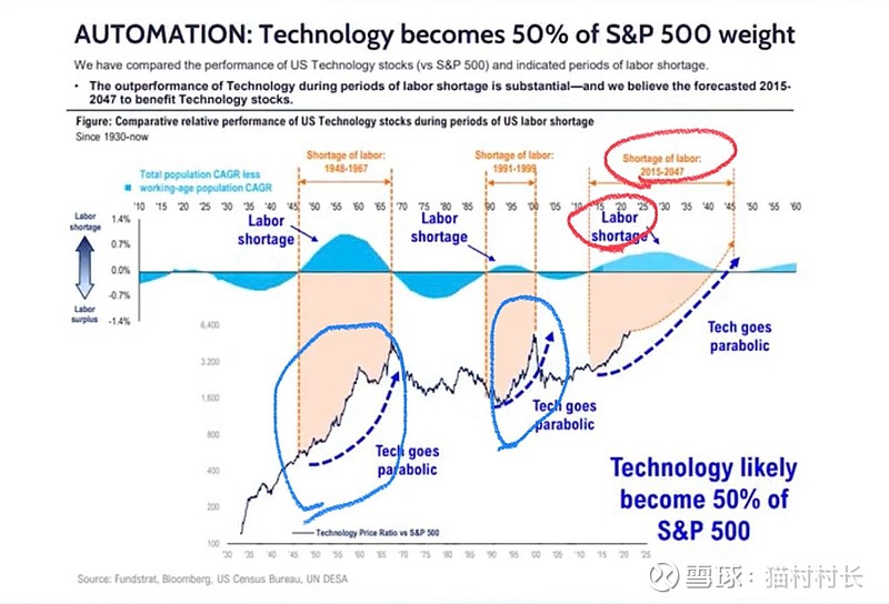 $纳指100ETF-Invesco(QQQ)$ $纳指3X做多-ProShares(TQQQ)$ 这张图有意思,把“劳动力短缺”当作一个大周期看,在这个大周期中,科技股的估值都能得到充分的释放,因为人不够,就只能用科技手段去替代人,从而给科技公司带来巨大的市场机遇和增长空间。