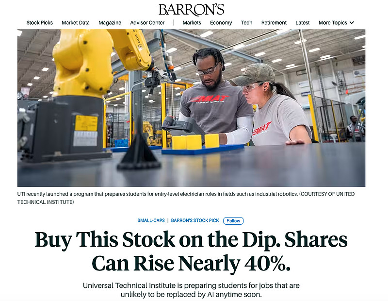 今天得到了巴伦周刊的推荐,在初级白领就业下降的确定趋势下,技工培训的前景能见度还是挺高的