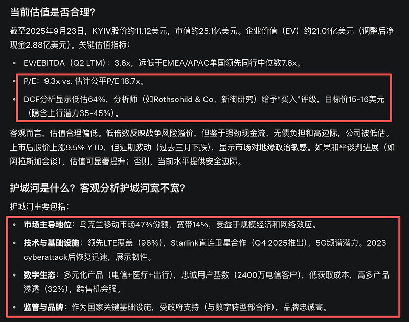 乌克兰经济复苏概念股~ 主要提供:移动通信、固定宽带、数字健康、出行和云服务。雪球的数据又是错的,目前 KYIV 的 PE 在 9-10 之间
