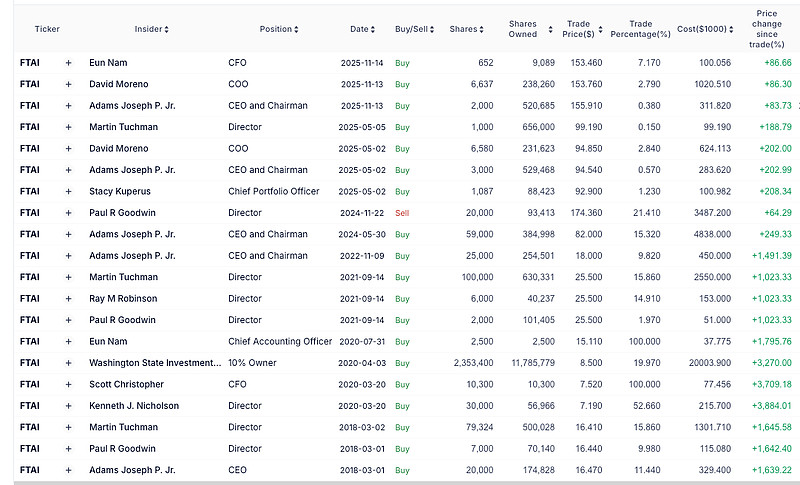 $Fortress运输基础设施投资(FTAI)$ 今天研究了下平时听都没听过,对于我来说媒体曝光量几乎为零的公司 FTAI。航空业的细分领域可真出猛货... 先来看下表现:年初至今:36%,1 年:145%,3 年:1,148%,5 年:1,306%,10 年:3,238%... 还投资什么半导体,还投资什么 AI... 内部人一直在买入,上次见到这么持续的内部人买入,还是在研究$美国锑(UAMY)$ 的时候:网页链接 但这行业未来可能遇到啥风险,真是一丁点都不懂,而且以后也不会太懂 😄 目前这个估值,是下不去手的