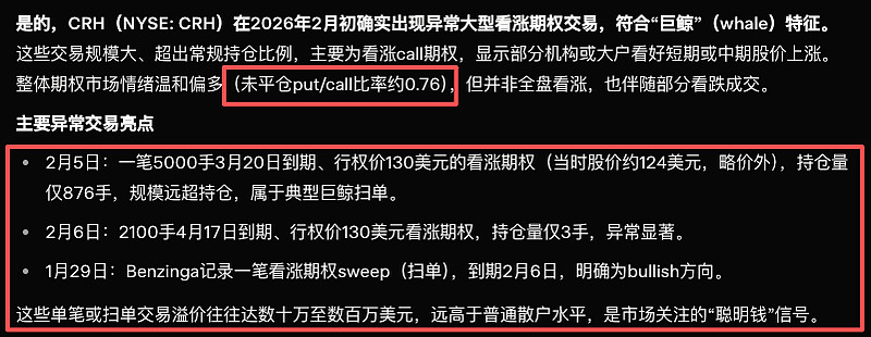 “乌克兰重建概念股”CRH 最近的巨鲸看涨期权信号(见下图)