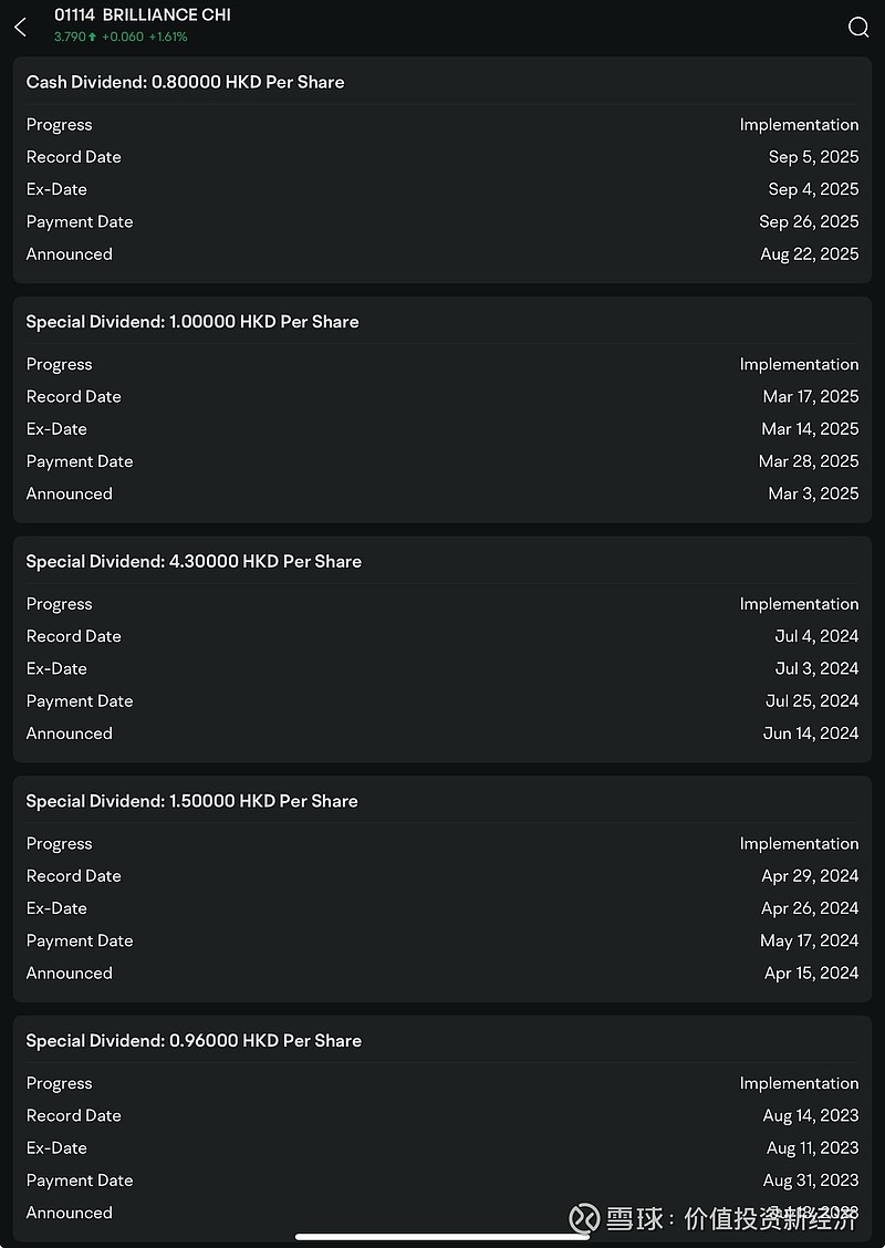 华晨中国 :依然大有价值+新世代option华晨中国虽然已经分了0.96+0.96+1.5+4.3+1.0+0.8的分红,公司依然是很有价值的。母公司还债表还没有还清(详情可以看看我的华晨中国系列),表上还有大量现金,每年有RMB3-4bn 盈利,如果都分红,那会是16-20%yield,在现在这种全球低利率政策环境下,这个稳定有高的收益依然非常可观 (那些想说宝马会被新势力干掉的旧故事已经说了三年了)。