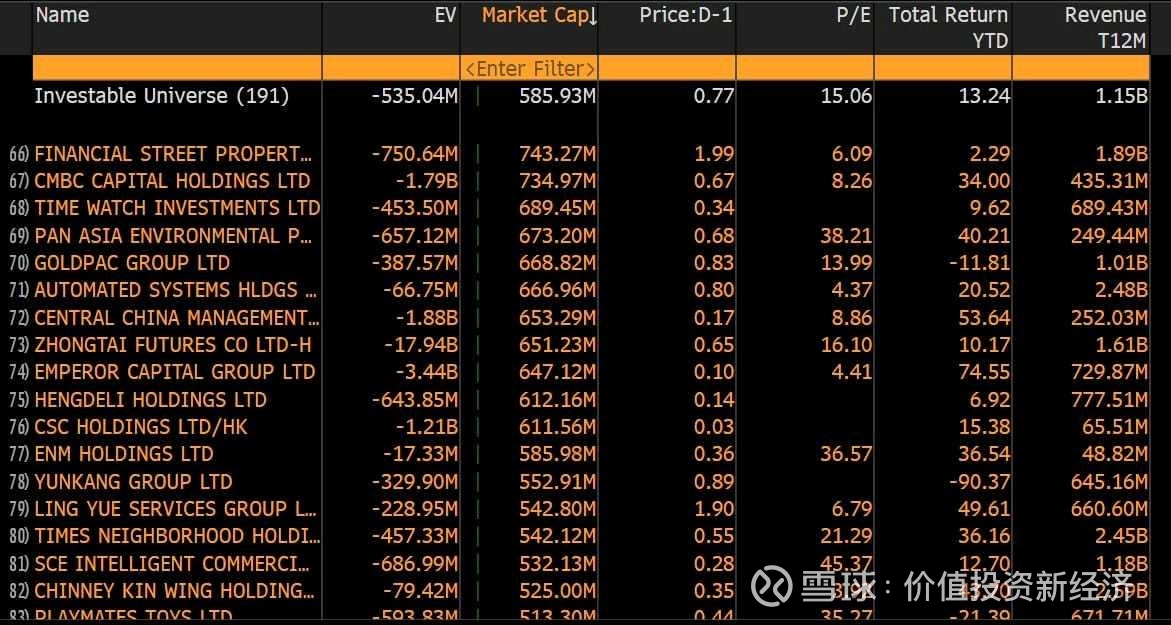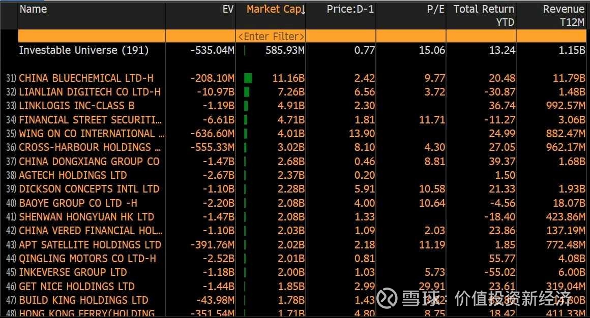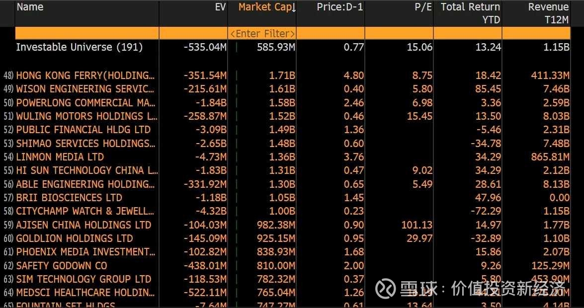 这几年,每年年底都发一个Bloomberg screen的NegativeEV公司 (NegativeEV = 市值减净现金是负的, 净现金是 Cash and Cash Equivalent minus total debt), 就是说公司市值扣除了现金,企业价值是完全免费的,NegativeEV是价值投资的顶峰。这几年也应验了NegativeEV的公司的回报通常非常好,$华晨中国(01114)$ 在2022年底的NegativeEV导致它2023/2024/2025年的回报都非常可观,同样的,2023年的NegativeEV的 ADR 也在2024年很好的回报,2024年底的创新药股在2025年更是涨了5-7倍,那些ADR扣除A股的市值也都涨了100%,eg $阿特斯太阳能(CSIQ)$ 。那2025年底还有那些公司是NegativeEV的会在2026年涨的很好呢?