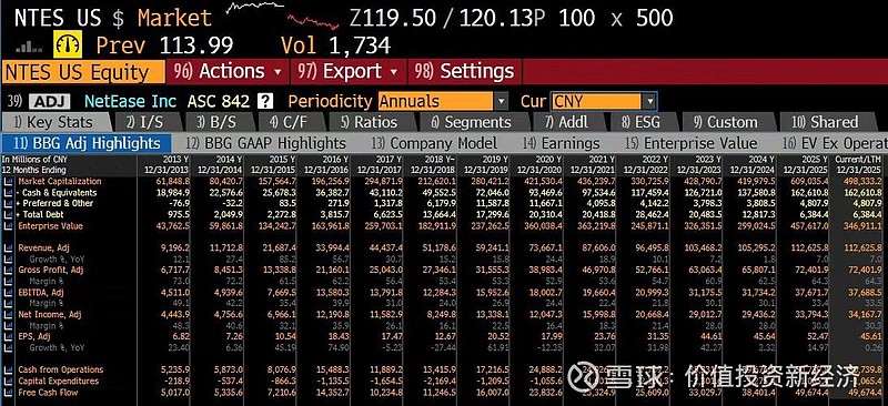 $网易(NTES)$ 现在 FCF Yield 14.4% ( FCF Rmb49.7bn EV 346.9bn), 以这样的FCF, 5年后如果股价不动(现在 USD113.99), 那网易的EV会降到 0 , 所有的业务免费。现在净现金已经是市值的 30%。放眼从网易2000年上市以来第三便宜 (最便宜2002年,NegativeEV,第二便宜2014年)。