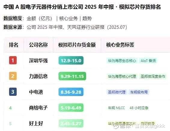 $深圳华强(SZ000062)$9月18日-20日,HW全连接大会将在上海召开;9月24日-25日,2025上海海思创新大会;9月27日,开源鸿蒙技术大会在湖南长沙举行。深圳华强:海思芯片全国总代,代理产品覆盖消费电子/汽车电子;力源信息:海思芯片一级代理商,HW智选生态核心伙伴;创耀科技:海思通信芯片核心设计方,5G模组出货量年增200%;世纪鼎利:海思5G基站测试设备独家供应商;盛剑环境:海思芯片制造环节洁净室龙头