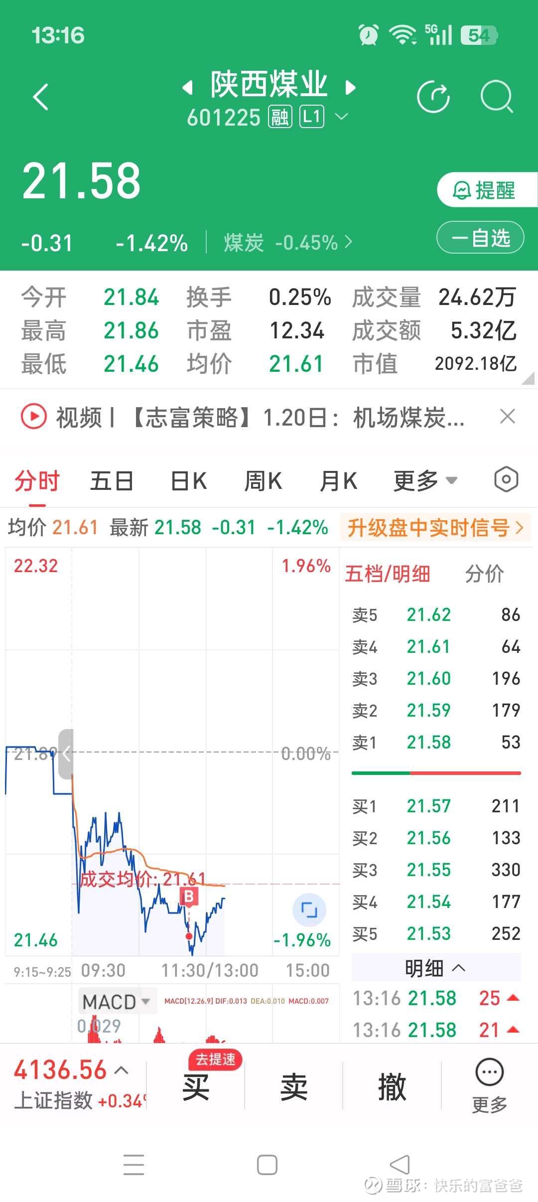 纠结着,总想买点啥,看来看去,21.50加点了陕西煤业,毕竟招商和长电都有不少了。