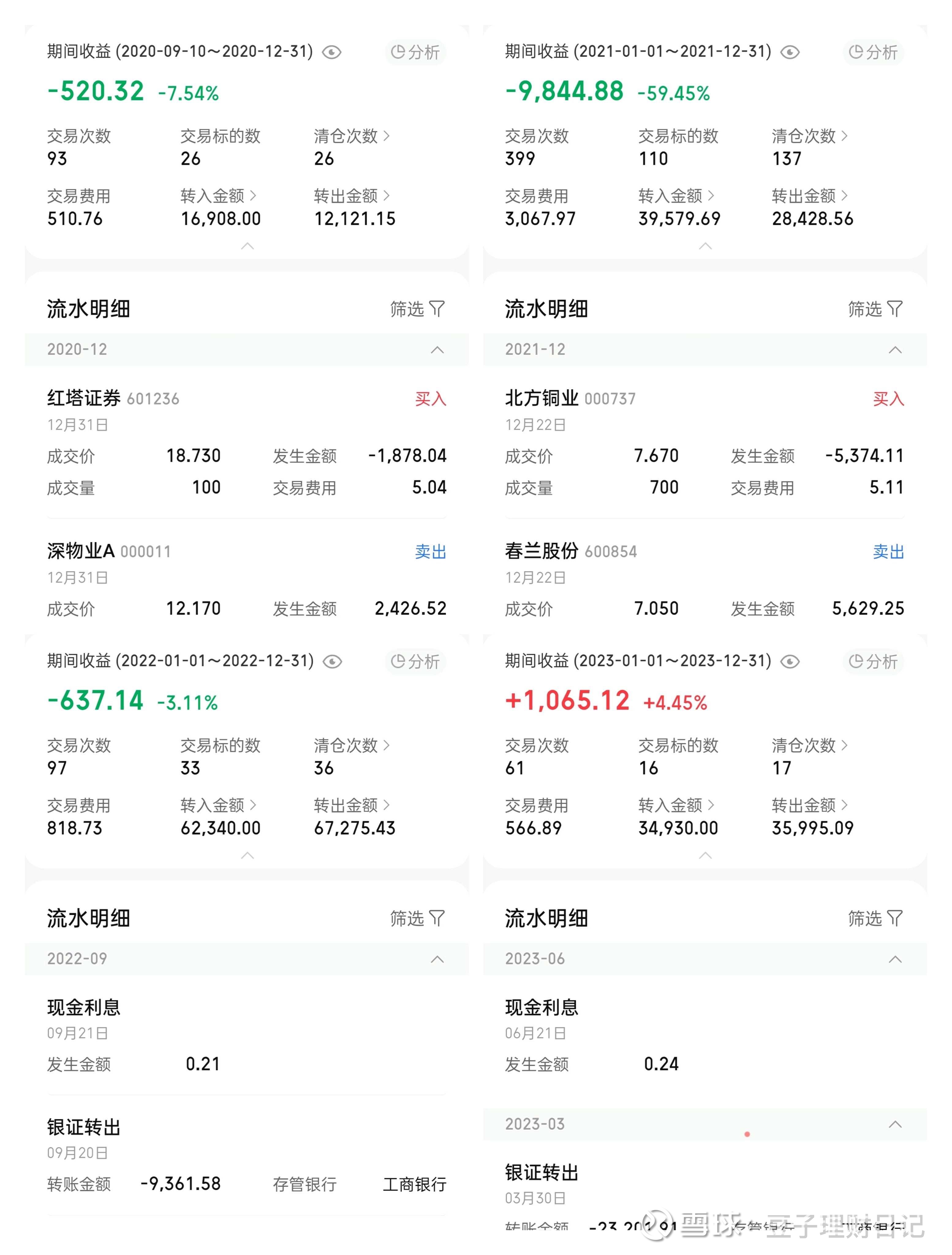 2020年,首战亏7.5%,520元;2021年,短线越炒越亏,全年亏损59.45%,足足亏了9800元,相当于一年的压岁钱;其中交易费就花了3k块,2022年收敛了操作,仍亏3.1%,637元。那三年,雪球上的盈利晒单看得我眼红,自己的账户却持续缩水,才慢慢意识到:跟风炒作的热闹里,藏着散户最容易踩的坑。