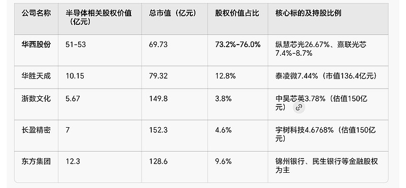 公司名称 半导体相关股权价值(亿元) 总市值(亿元) 股权价值占比 核心标的及持股比例