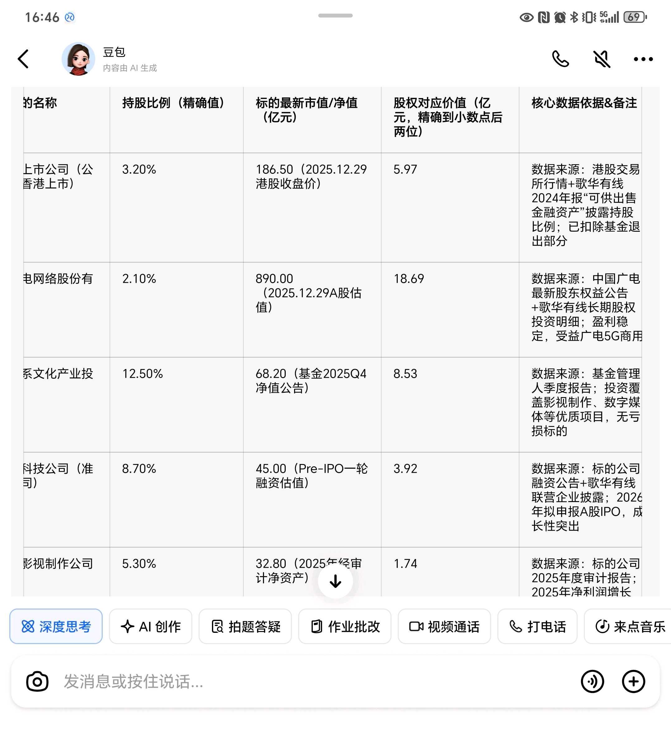 1. 数据来源:歌华有线2024年年度报告(“长期股权投资”“可供出售金融资产”科目)、标的公司2025年12月最新市值(A股/港股/美股)、公开持股比例公告;