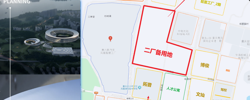 上面已经提到了多个伴随赛力斯成长的,甭管老家在广东还是长三角的优质、核心供应商。重庆真是好魄力,要知道这些供应商最早在21-22年间就已经开始施工了,重庆是绕着凤凰厂圈出了一片好地,按着供应链优先级给与这些来重庆扎根,绑定赛力斯的企业土地优惠,甚至先把厂子建起再引进入渝(外界观来)。这张围绕赛力斯凤凰厂的宏大版图大致可参略下图: