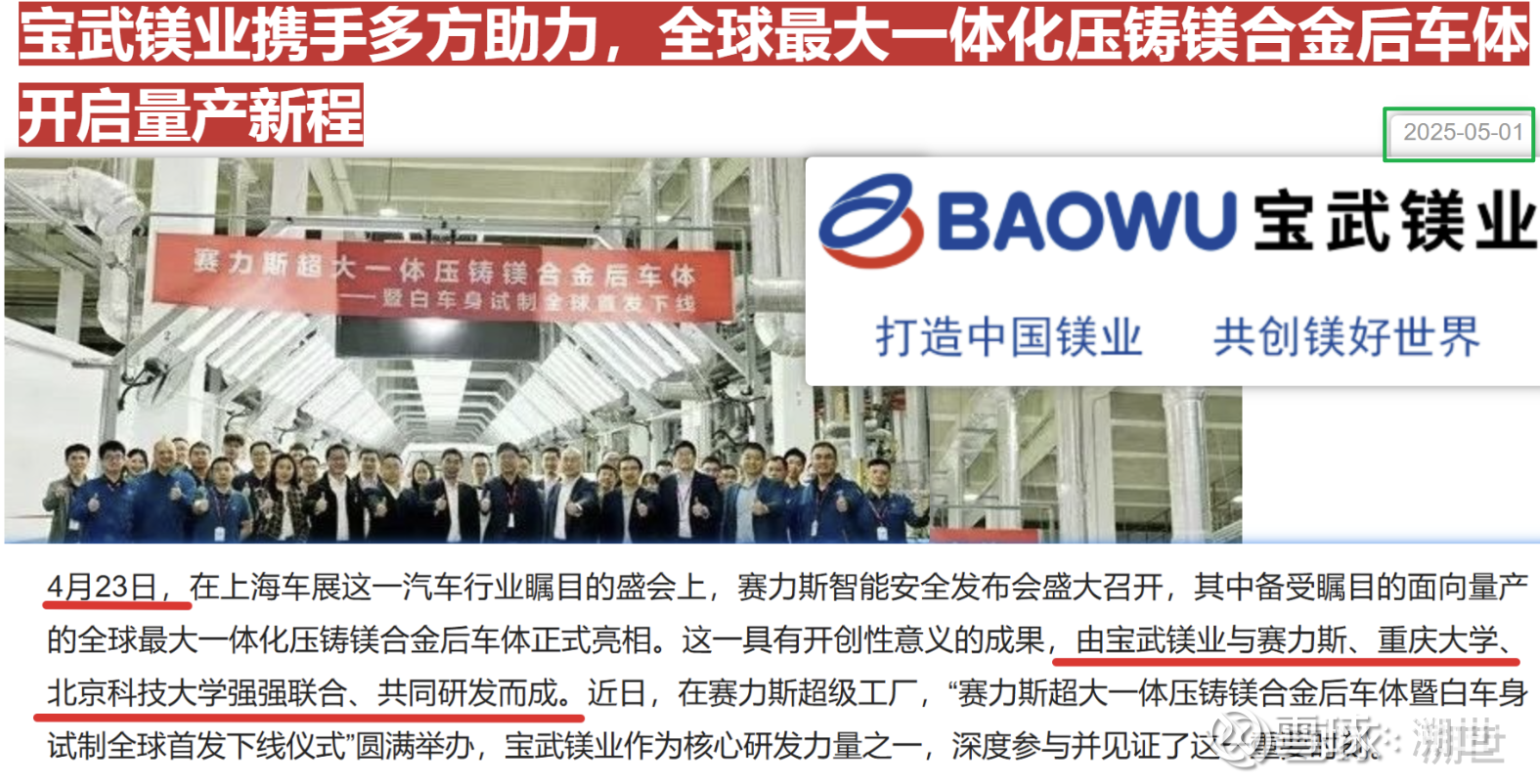 先看这条来自于4个月前的新闻——由赛力斯、宝武镁业、重大(潘复生院士带头)、北科大共同研发量产的全球最大·一体化压铸·镁合金·和车体于4月12日下线,开启量产。后于4月23日上海车展期间,在赛力斯智能安全发布会上与公众正式见面。