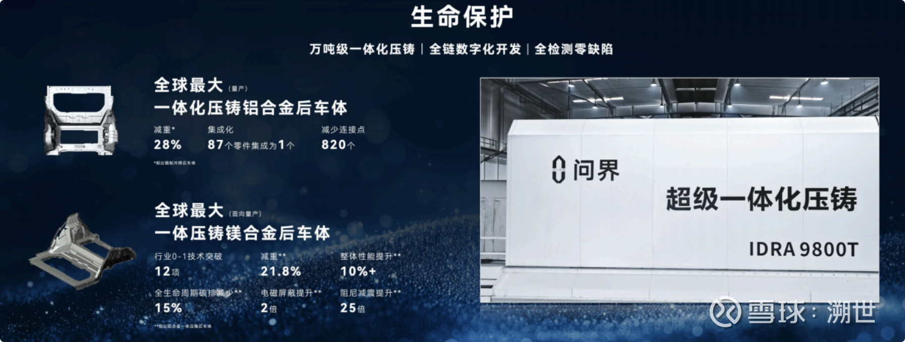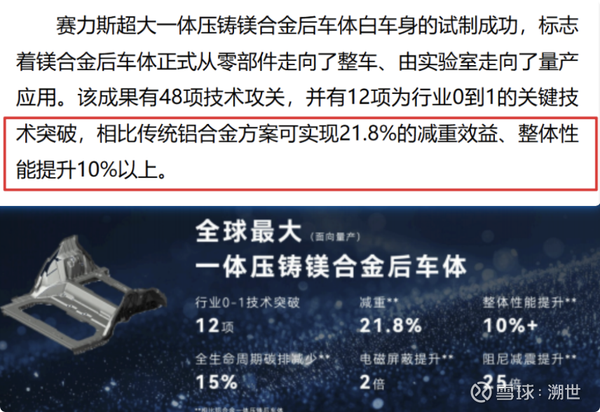 考虑到镁合金1.8g/cm^3与铝合金2.7g/cm^3的密度之比,单位体积的金属成本仅为铝合金的60%,但实际我们不可能用相同体积的镁合金做出同样强度的铝合金构件。工艺可以赋予材料更强的性能。需要多少?这个数字正好可以通过新闻报道包括赛力斯智能安全发布会的PPT中提及的关键数字——21.8%的减重效益进行测算。