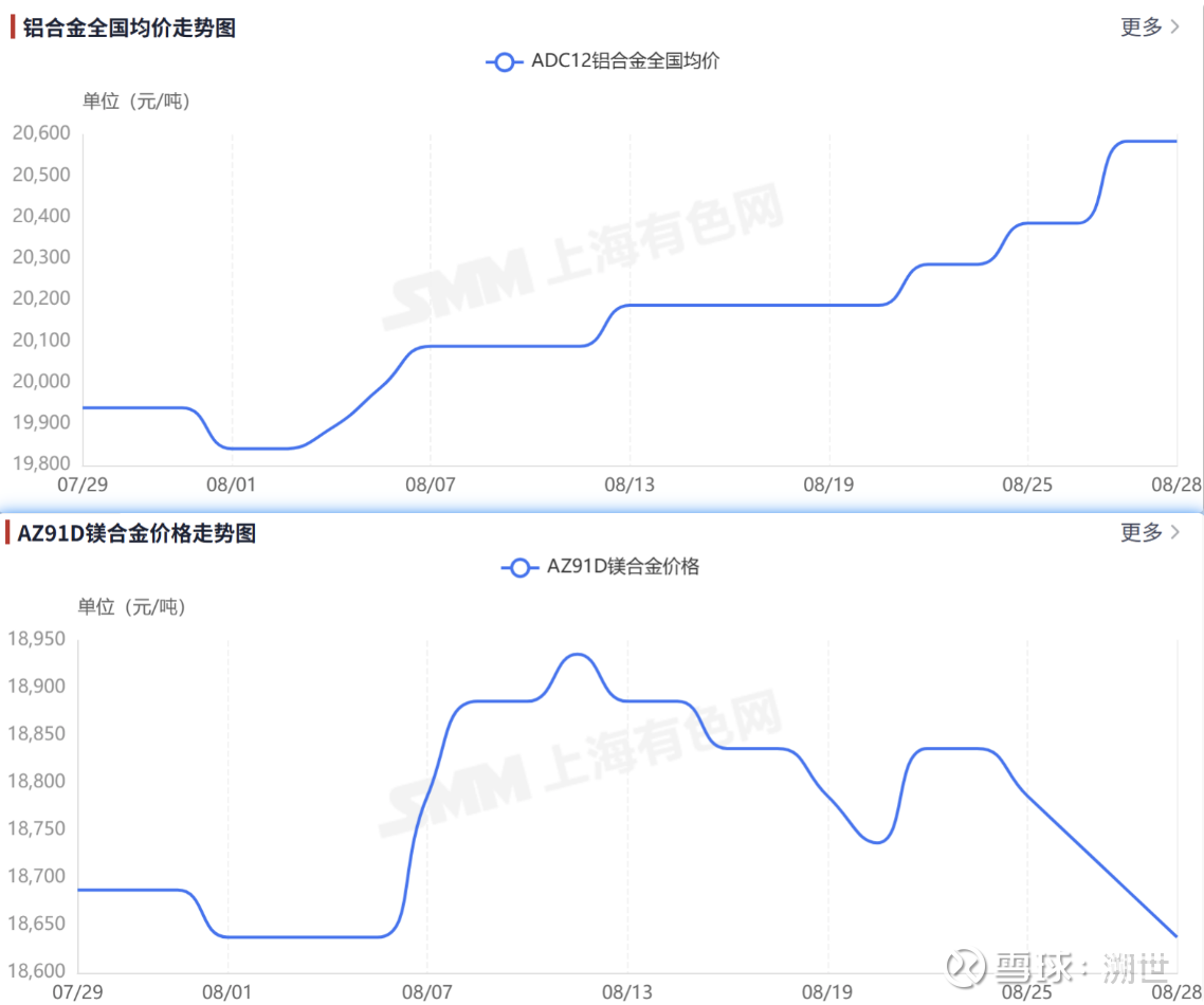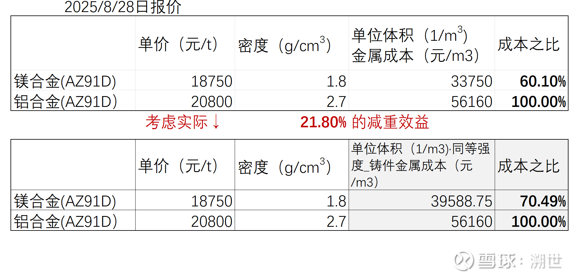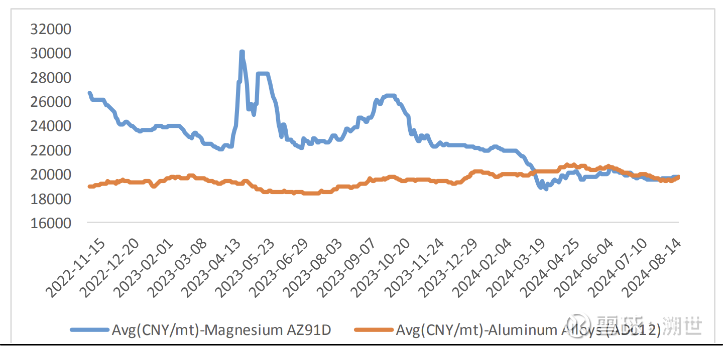 其中很关键的一点正是镁合金的价格比铝合金便宜了。整个8月也维持了接近2000元/吨的价差。比起去年同期,单位价格亦有1000-1500快的跌幅,比起电车第一波浪潮21年之际7w元的峰值,已经是腰斩再腰斩。这是镁合金有望成为新的主流轻量化材料规模应用的首要条件。