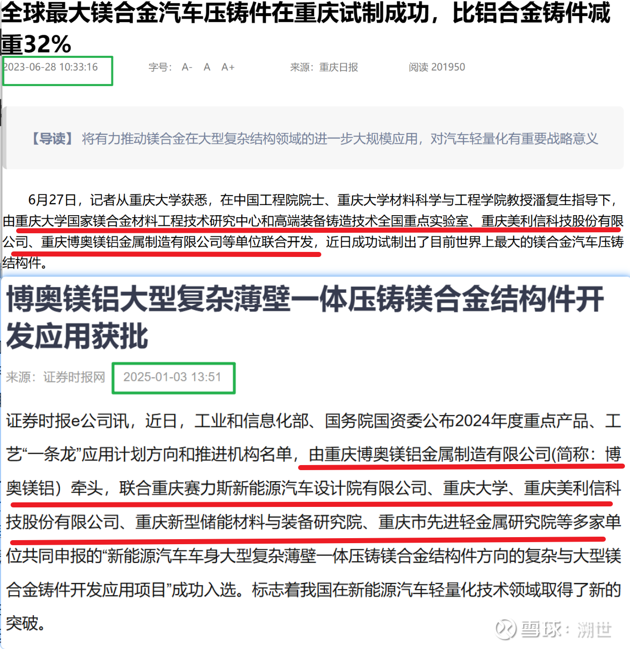 早在23年6月我就在论坛发过潘复生院士带领重庆大学团队成功试制超大镁合金一体压铸件的新闻,那时候参与方还没有宝武镁业,更没有赛力斯,最后落地的也非两年前提及的32%(因为那会的试制成果忽略了工艺性能,只强调力学性能——诸位可以理解为赛力斯做量产车的要求是更高的)。