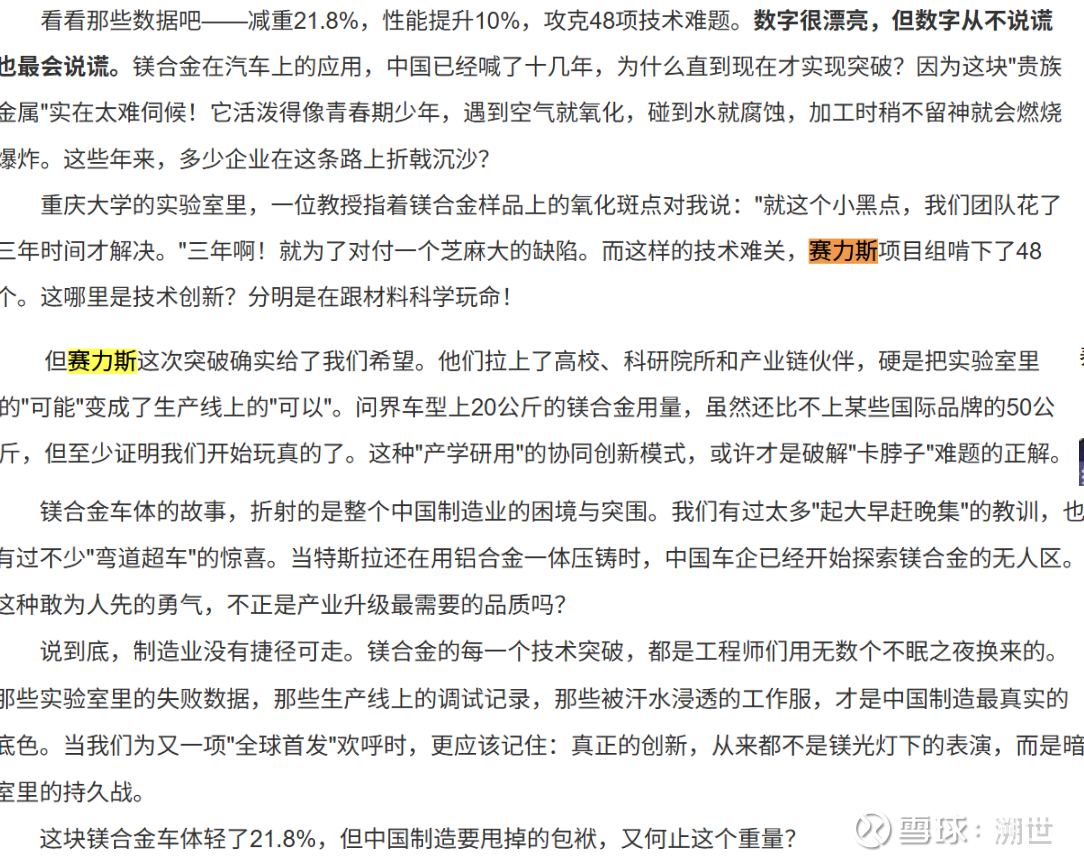 还是回到和宝武镁业的合作上来。有关赛力斯在这个合作中扮演了怎样的角色?多方克服了怎样的难题?这篇名为<镁合金车体背后:中国制造的"硬骨头"与"软肋">报道的文笔不错,我就直接引用了: