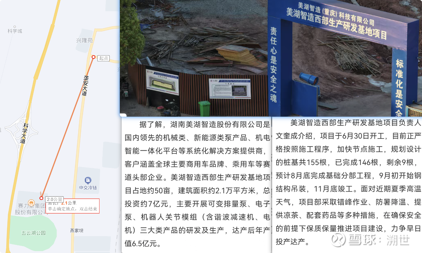 还是经常聊的老话,资本市场对赛力斯的反应是严重滞后其规划的。有关机器人,我一直的态度还是,不给出demo,不给出货节点与出货量,对大盘子赛力斯意义并不大。再加上赛力斯对于机器人一直是三缄其口,即便我们扒拉出这么多你在干机器人的事实…但其中最重要的事实就是——土地与厂房。你产能一直在爬,规划的厂房都有既定储备的用途,做机器人总要建厂房吧,那美湖的意义就在于,它是赛力斯藏不住的“副厂房”。至于主厂房在那里,我觉得最大可能就还是青凤凤凰二厂的两大块超大储备地了。最近也有了破土动工的迹象,且先别管它是不是真为了机器人吧,来看——