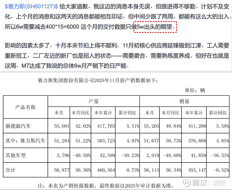$赛力斯(SH601127)$ $宝武镁业(SZ002182)$ $美湖股份(SH603319)$ 老朋友应该都知道月产销快报该咋看了,我前面又给出两次预告:包括配套工厂搬迁重新招工等外部内部的原因,二厂产能比预计的少了1/4,中旬才开双班,一厂又加紧试制M6,整体完全是预期之内的数据。