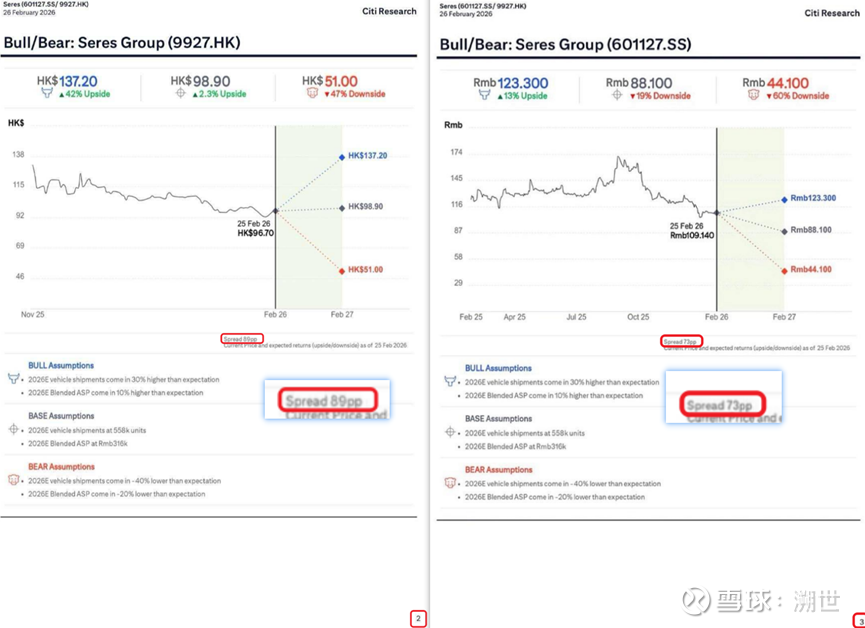 1)其中第2页和第3页内容额外给出了港股、A股乐观悲观假设的目标股价的预测。但区间差高到89%的估测——这也太不自信了,金融行业不讲统计学了?95%的置信区间才是可采信的估计结果,拿不准可以不露怯啊。还是说花旗的分析师在大喊,“朋友们,我们有95%的把握股价会在腰斩和翻倍之间!”——这毫无意义。这两张图的看板又或者ppt股价小数点位数还不统一,港股两位小数,A股三位小数了,建议花旗的数仓或者分析师个人改过。