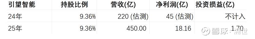 24年末,赛力斯汽车完成对引望智能10%股份的收购(下图持股比例9.36%是因为赛力斯汽车有少数股东),引望的投资收益的计入始于25Q2。我们直接看图说话,根据2024年上半年引望主动披露的财务数据,24全年营收估测为220亿对应45亿净利,净利率为20.45%。25年根据赛力斯和华为方面的年报450亿营收却只收获18.16亿的净利润,赛力斯投资收益仅为1.7亿,与我们预期的不说七八亿,至少四五亿的收益相差甚远。