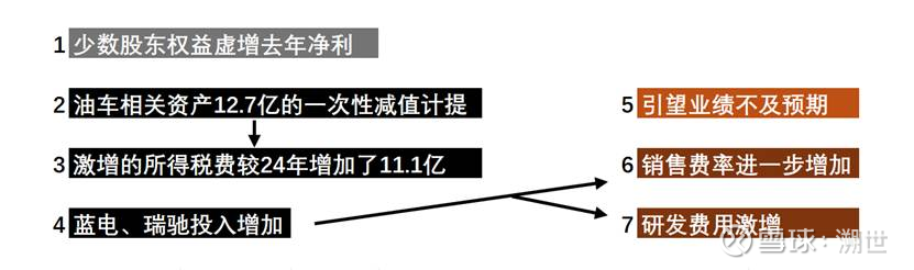 c. 24年的大额减值(12.7亿)没有像24年的大额减值确认为递延所得税收益。24年22亿的减值为新能源车相关,递延所得资产大幅增加3.7亿;25年12.7亿的油车资产计提减值,未确认递延所得税资产——公司判定油车不会再赚钱,全面退出油车板块的竞争。致使所得税费调整过程中有+6.9亿调整;