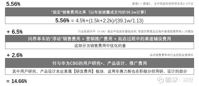 涉及销售费用的“浮动部分”,也就是一般意义的营销费用——我这边以行业前部水平(4%-6%)减去中低端车基础返利,在考虑四季度反应出的海外渠道拓展,以及蓝电瑞驰的市场渠道的投入带来的1-2个点的增加,这里我给出问界板块6.5%的“浮动”销售费率。进而推得付与华为CBG得用户研究、产品设计、推广费用费2.6%,对应(39.1w/1.13)*42.6w辆*2.6% = 38.32亿销售费用——其中用研、产品设计本应属于研发费用栏目,这两年赛力斯也在积极分担用户研究、产品设计的部分。
