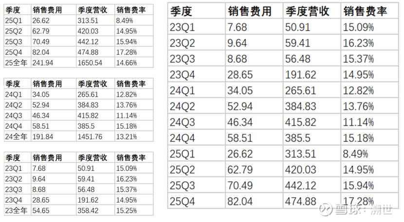 全年14.66%的销售费率,四季度更是升到了17.28%,营收可是增大了的,规模优势哪去了?行业惯例四季度促销销售费率确实会高些,并且有我前面提及的瑞驰重新招商,新品发布,营收利润未释放,但依然不足以解释四季度之高。25Q2较25Q1的跃升实在扎眼,25Q4逼近23上半年M7暴毙+鸿蒙智行风雨飘摇时期的水平,那时候官降又官降、补贴又补贴……